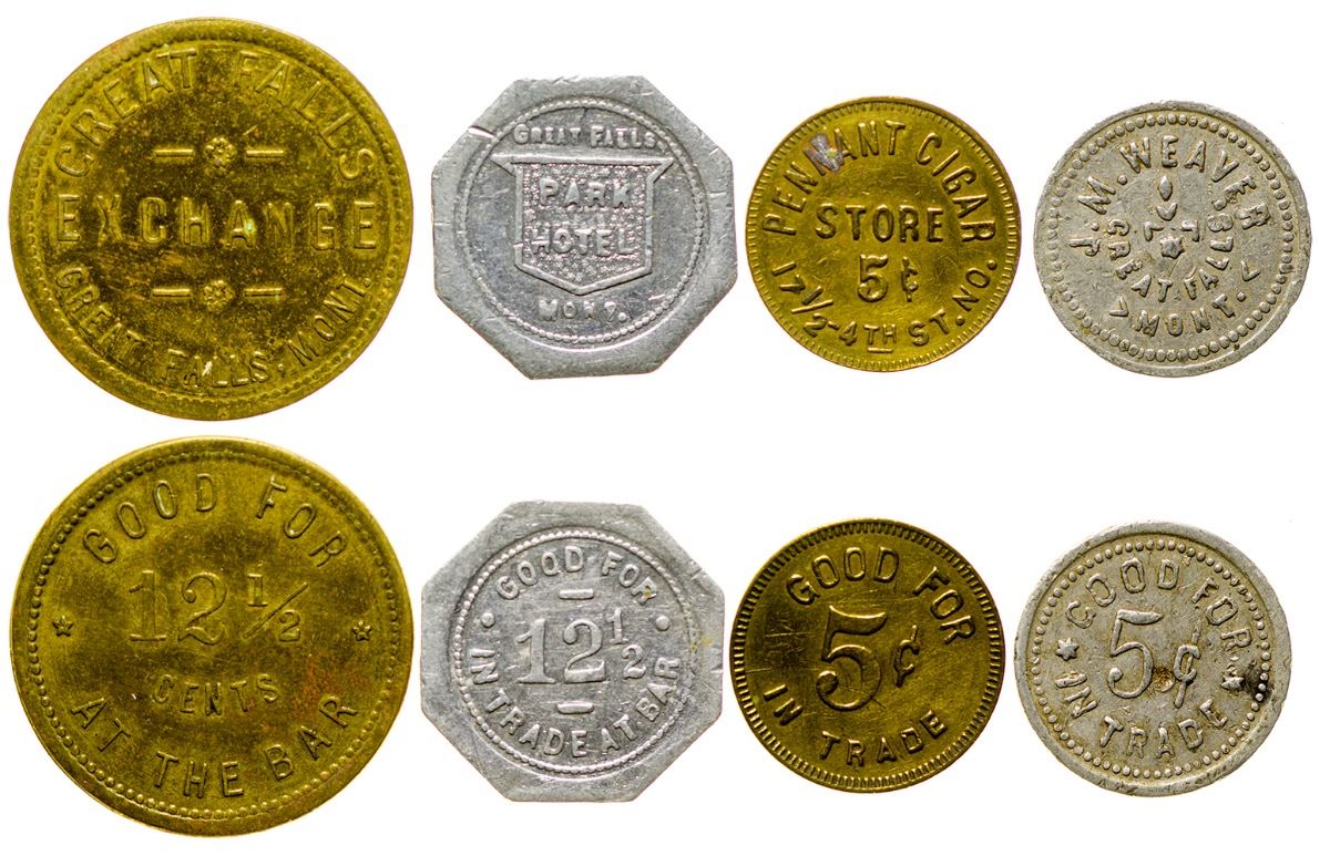 1) J. M. Weaver / Great Falls / Mont. // GF / 5c / IT. Round, aluminum, 21mm. 2) Unlisted. Great Falls / Exchange / Great Falls, Mont. //GF / 12 1/2c / At The Bar. Round, brass, 30mm. 3) Unlisted. Pennant Cigar / Store / 5c / 17 1/2 -4th St. No. // GF 5c / IT. Round, brass, 21mm. 4) Great Falls / Park / Hotel / Mont. //GF 12 1/2c / IT at Bar. Octagonal, aluminum, 25mm. No cut hole. (Svoboda Collection) City: Great Falls State: Montana Date: HWAC# 35053