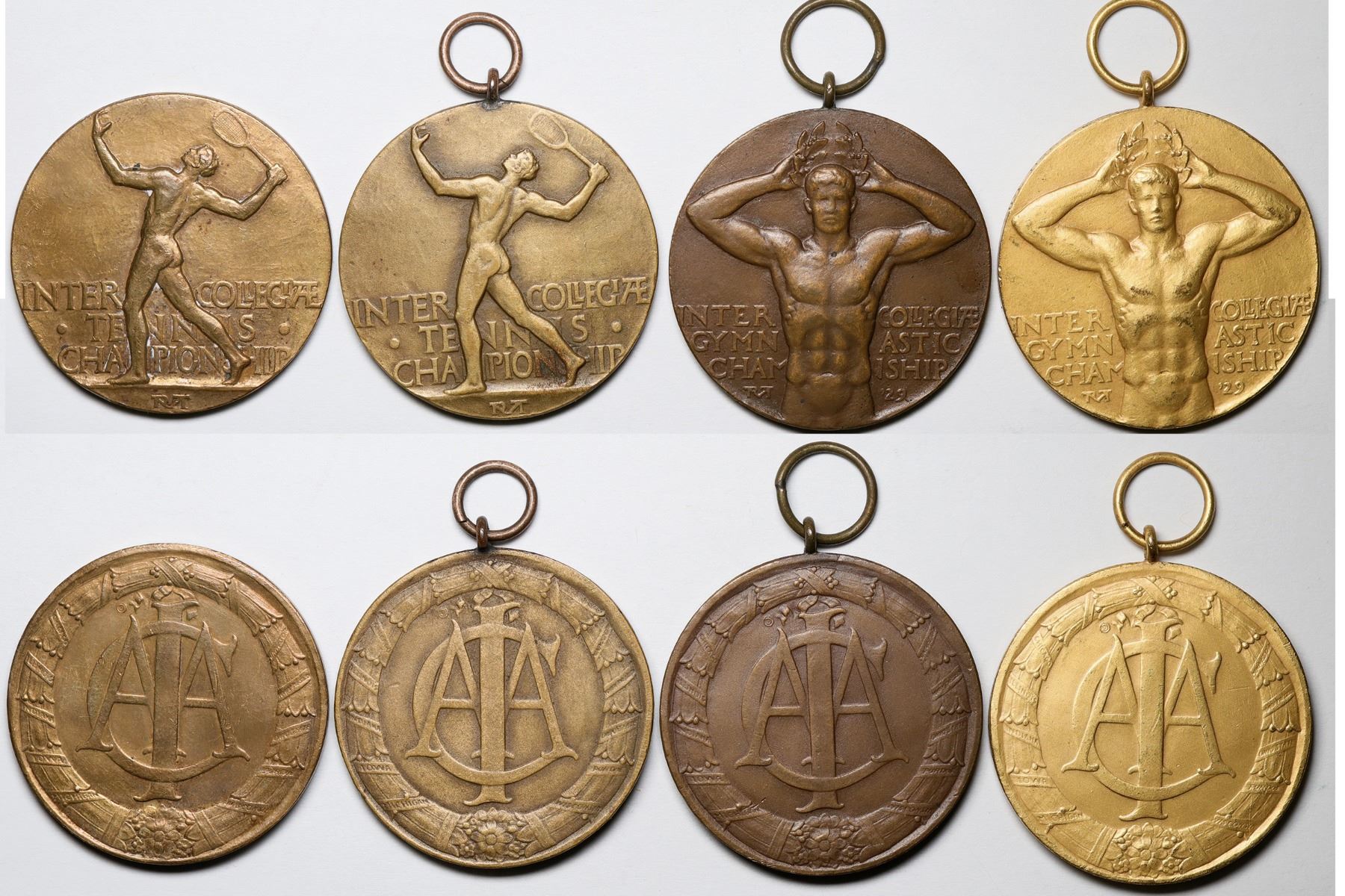 Four Intercollegiate Championship medals that appear to be made of four different metals, from 1921 to 1943. All approx. 1-1/2 inch in diameter. Includes what appears to be gold Intercollegiate Gymnastic Championship medal with ring dated on obverse, '29, engraved on edge, "SIDE HORSE 1st 1943"; Intercollegiate Tennis Championship (no date), appears to be gold plated; brass Intercollegiate Tennis Championship with ring, dated on obverse, 1921; and bronze Intercollegiate Gymnastic Championship with ring, dated on obverse '29, engraved on edge, "ALL AROUND CHAMPIONSHIP 4th 1943." See photos for details.