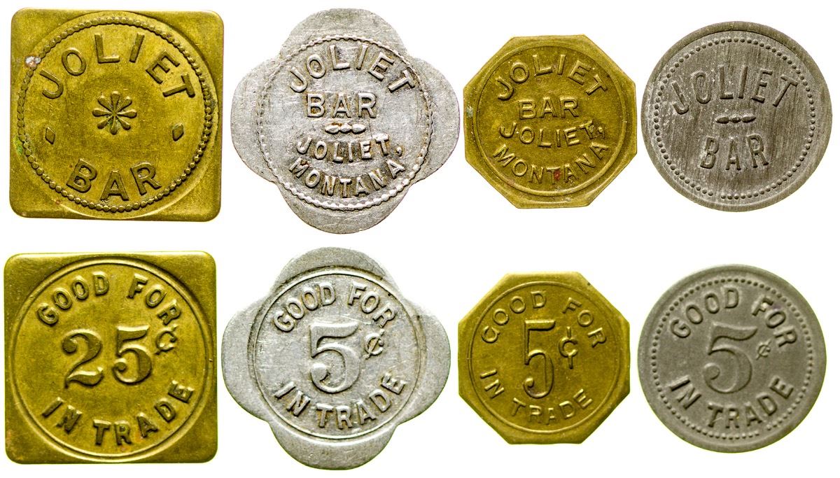 R-7. Joliet / Bar / Joliet / Montana // 3-5c (round, brass, 20mm, octagonal, brass, 20mm, scallopped (4), aluminum, 24mm); 1-25c (square, brass, 22mm) / IT. 25c, center has flower design. (Svoboda Collection) City: Joliet State: Montana Date: HWAC# 35059