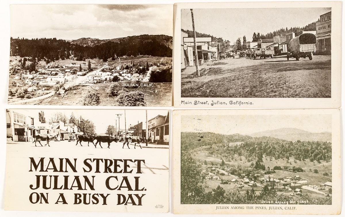 Lot of 4 photos of the mountain town east of San Diego. Main Street, Julian among the Pines, View from a hilltop, Main Street on a Busy Day (cows crossing Main Street). City: Julian State: California Date: ID# 44449