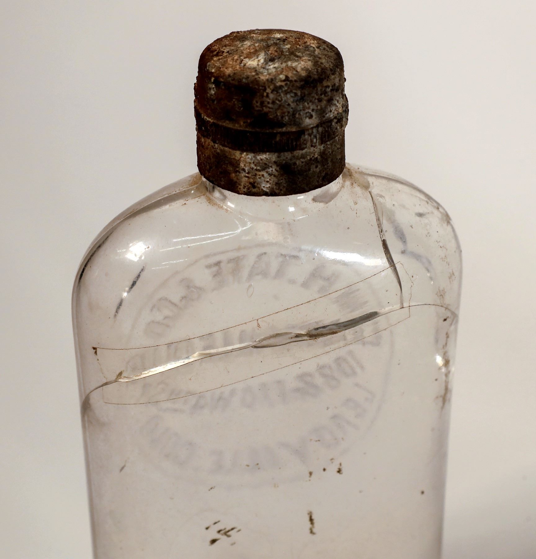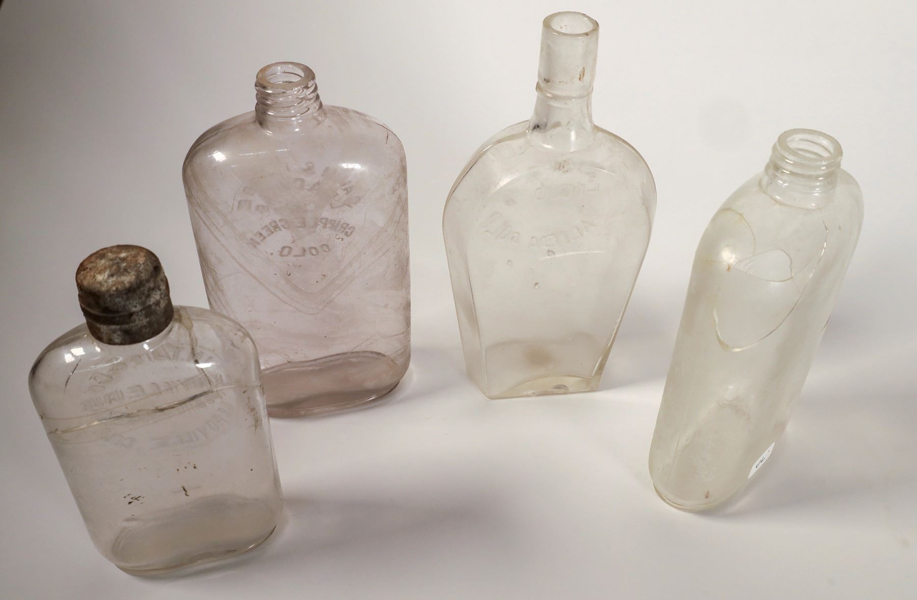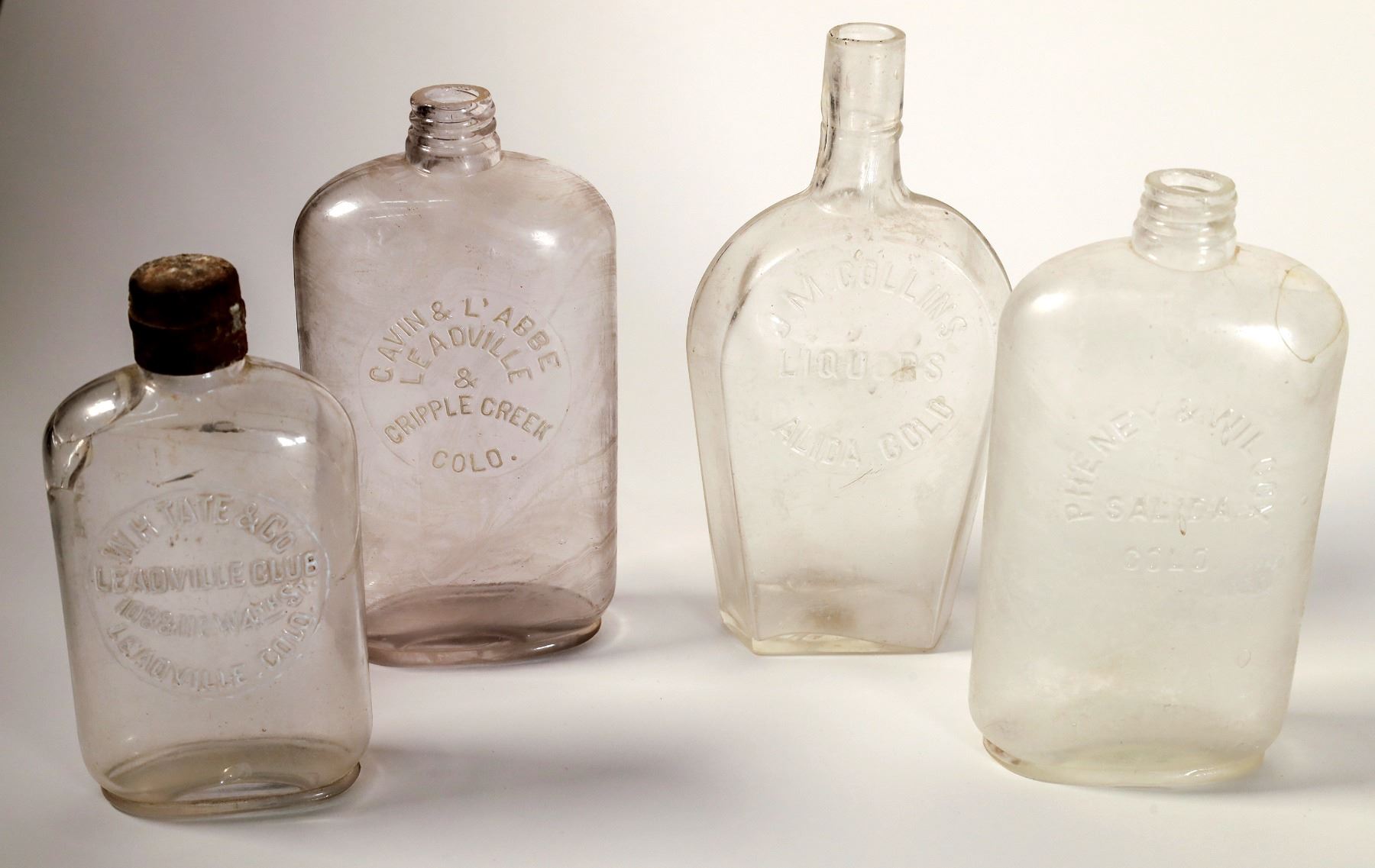 1) WH Tate & Co. / Leadville, 108 & 110 W. 4th St. / Leadville Colo. Half pint. Bad crack reverse. 2) Gavin & L'Abbe of Leadville and Cripple Creek. Pocket flask. Pint. Ground top. Light stain. Appears mint. 3) JM Collins of Salina. Coffine flask. Crack in base and in back. 4) Pheney & Wilcox pint. Salida. Pocket flask. Badly cracked and repair on back. Top left on back is missing a piece. See photos.
