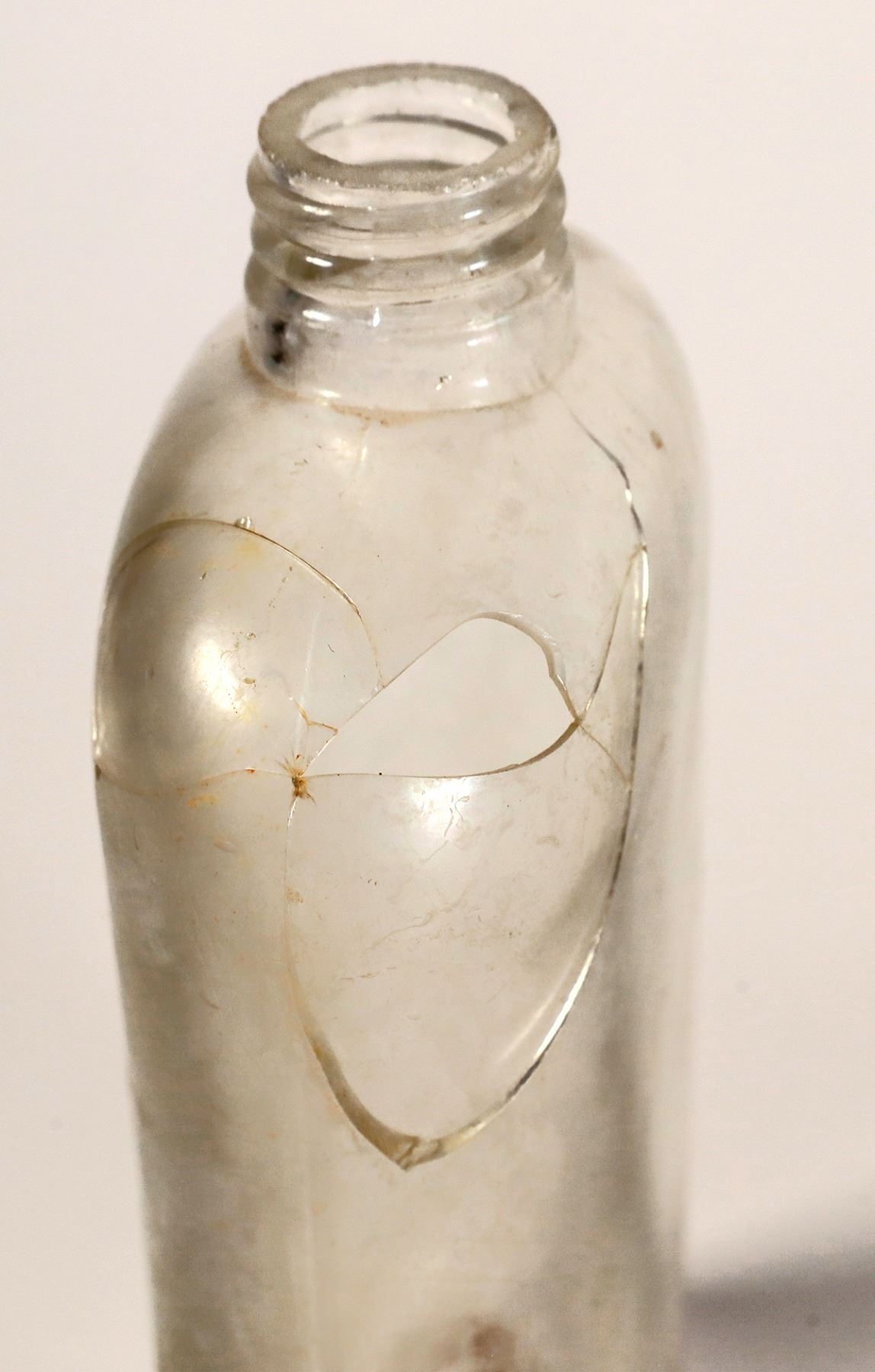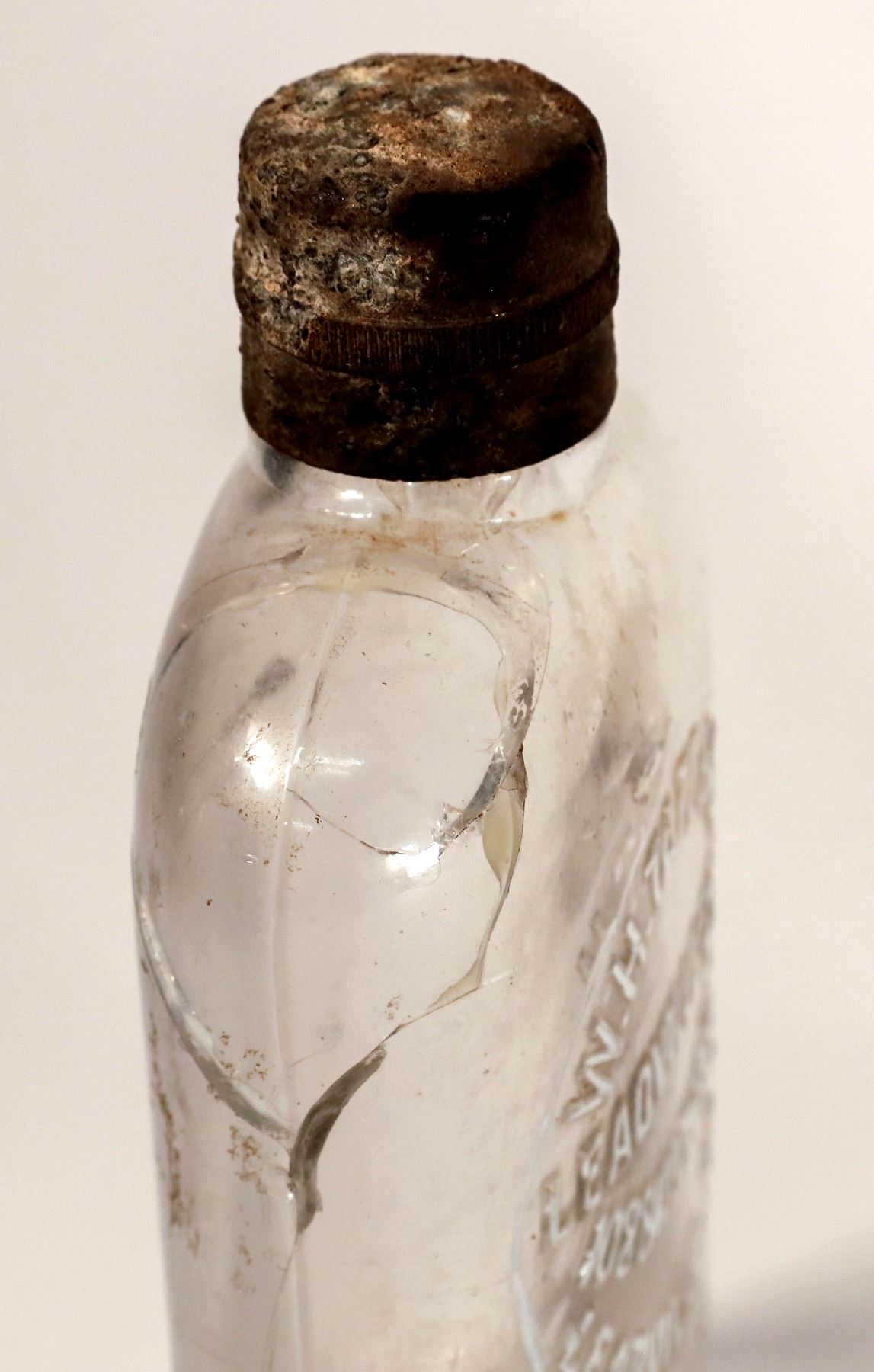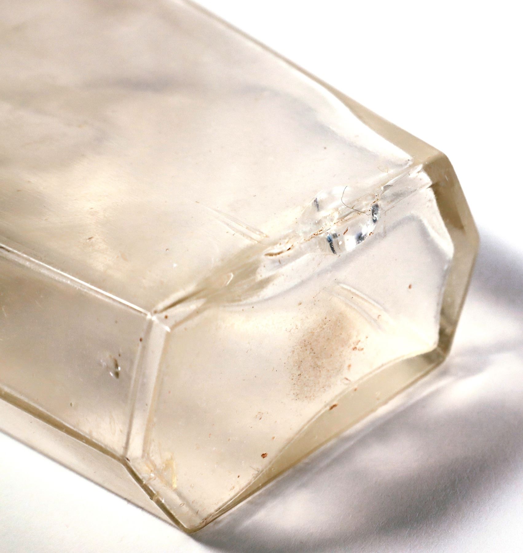 1) WH Tate & Co. / Leadville, 108 & 110 W. 4th St. / Leadville Colo. Half pint. Bad crack reverse. 2) Gavin & L'Abbe of Leadville and Cripple Creek. Pocket flask. Pint. Ground top. Light stain. Appears mint. 3) JM Collins of Salina. Coffine flask. Crack in base and in back. 4) Pheney & Wilcox pint. Salida. Pocket flask. Badly cracked and repair on back. Top left on back is missing a piece. See photos.