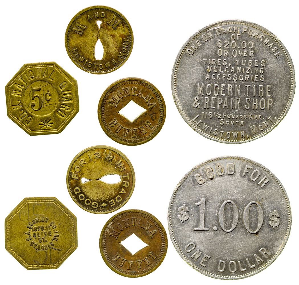 Four different tokens. Montana Buffet, Modern Tire & Repair Shop, M & M, Co. K. National Guard. (Svoboda Collection) City: Lewistown State: Montana Date: HWAC# 35905