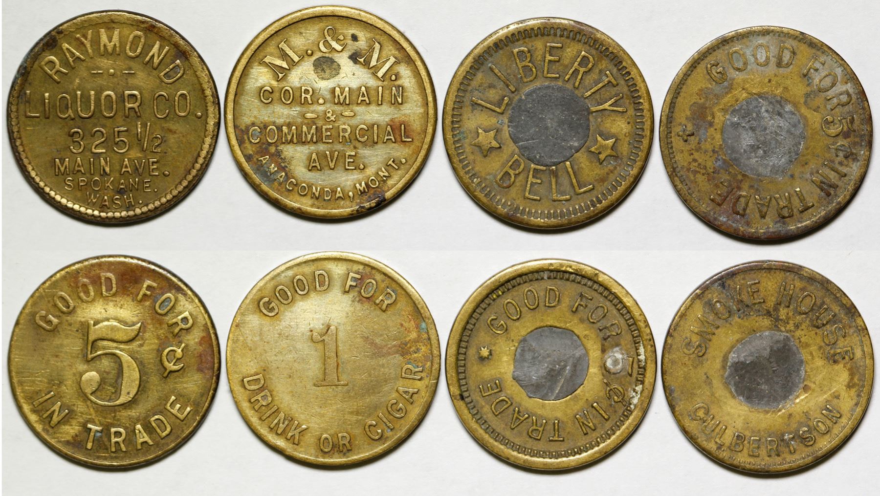 Lot of four: 1) Obv.: M & M / Cor. Main / & / Commercial / Ave. / Anaconda, Mont.; Rev.: Good For / 1 / Drink or Cigar; Br., rd., 21 mm, R5. 2) Smoke House / Culbertson; Rev.: Good For 5c In Trade; Bimetallic, rd., 21 mm, R5. 3) Obv.: Liberty / Bell; rev.,: Good For 5c In Trade; Bimetallic, rd., 21 mm. 4) Raymond / Liquor Co. / 325 1/2 / Main Ave. / Spokane / Wash.; Rev.: Good For / 5c / In Trade; Br., rd., 21 mm. State: Montana City: Date: