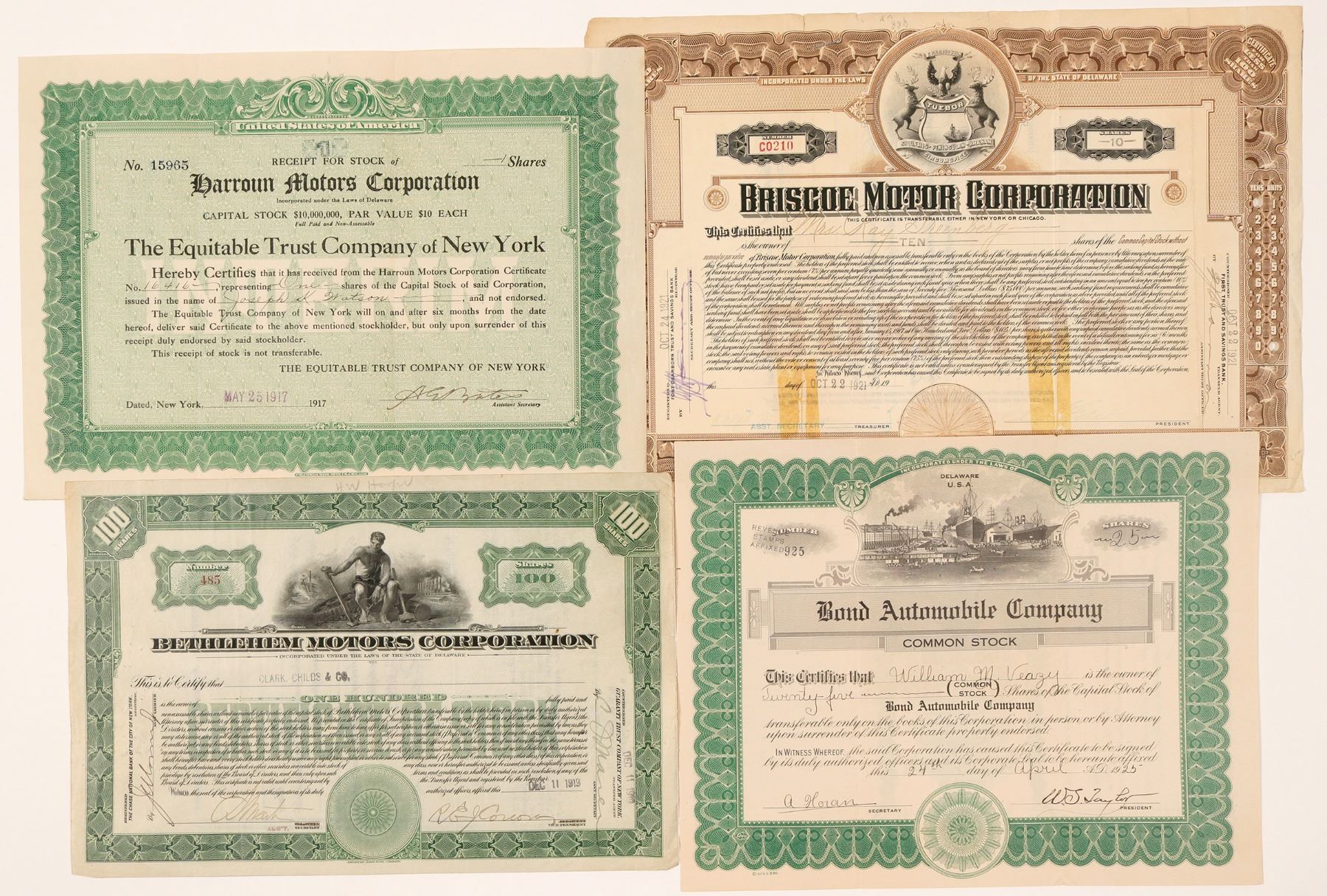 Bethlehem, Harroun, Bond, and Briscoe. Briscoe has a logo vignette. Bond shows a wharf. Bethlehem is the lowest number at 485. Three green and one brown cert. Condition is poor to very good. Ken Prag Collection