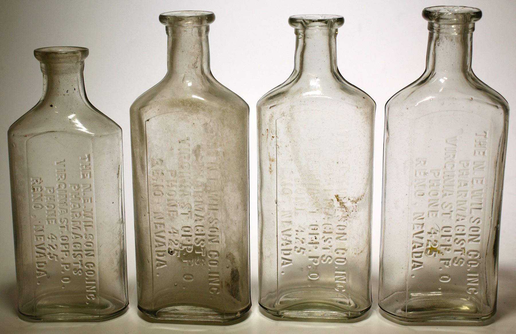 ( Lot of 4. ) Lots #1, 2#, #3 of 4... N. E. Wilson Co.. Inc /Pharmacists / Virginia St. OPP. P.O. / Phone 425 / Reno Nev. // Penn Ovals.. Tooled tops, 2 clean n mint, one medium overall inside stain. No other damage on these 3 lots. Lot #4 of 4: same embossing as the previous lots., smaller size.. 6 1/4" x 2 5/8".. light stain, otherwise nice. ( FH ).