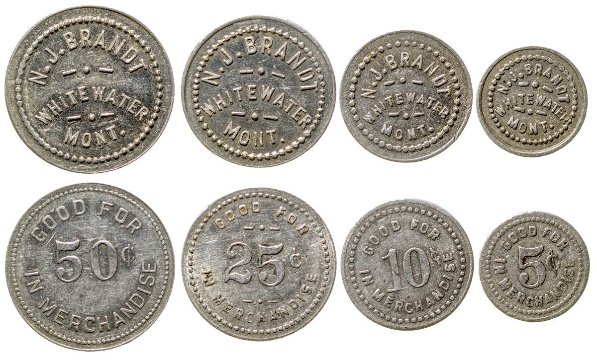 N. J. Brandt / Whitewater / Mont. // GF / 5c, 10c, 25c, 50c / In merchandise. Round, aluminum. (Svoboda Collection) City: Whitewater State: Montana Date: HWAC# 35871