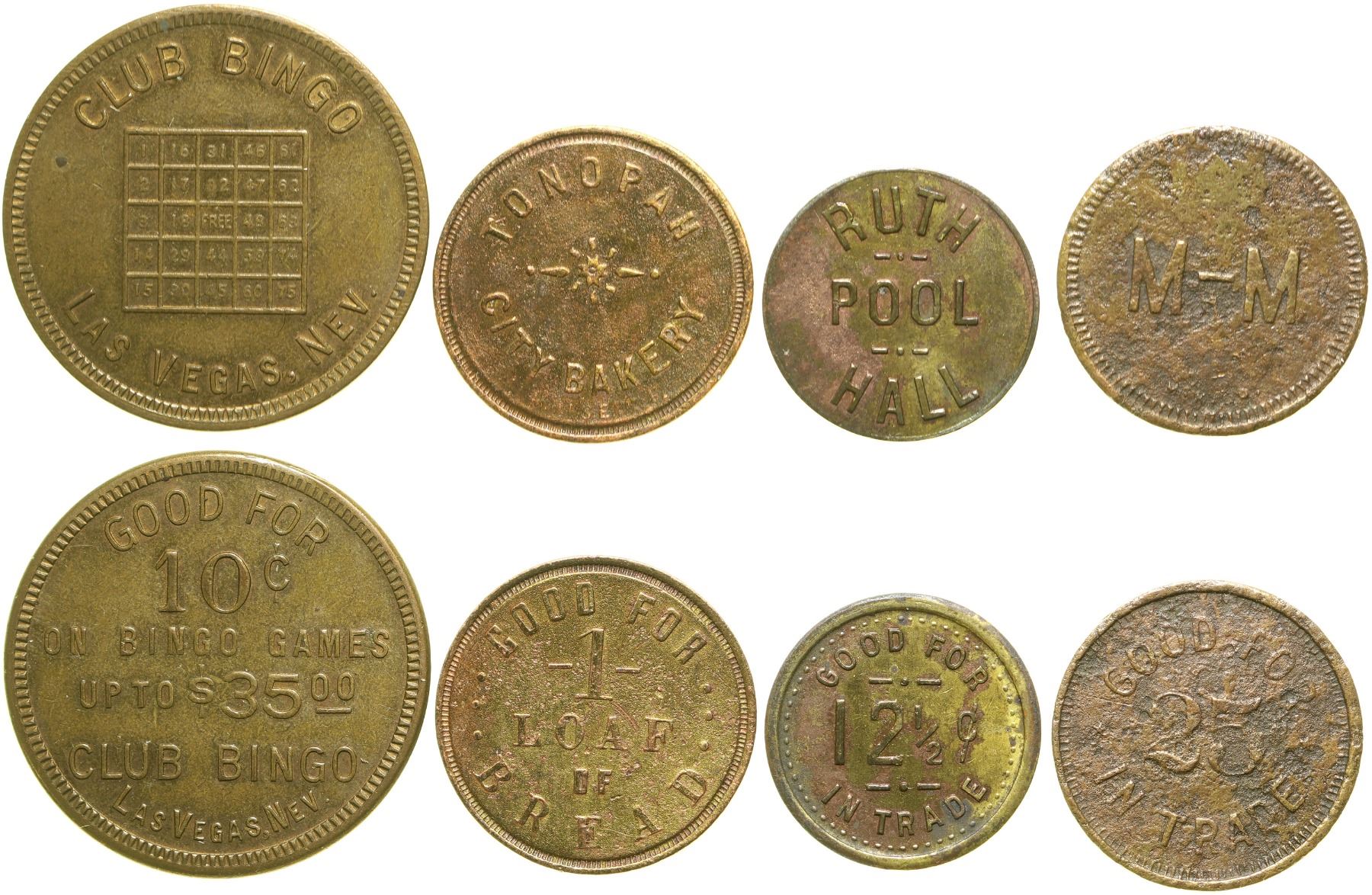 Lot of four: 1) Club Bingo / Las Vegas, Nev.; rev.: Good for / 10c / In Bingo Games / Up to $35.00 / Club Bingo / Las Vegas, Nev.; br. rd., 33 mm. 2) Ruth / Pool /Hall; rev.: Good For / 12 1/2 c / In Trade; br. rd., 21 mm. 3) Yerington, M - M; rev.: Good For / 25c / In Trade; br. rd., 24 mm. 4) Tonopah / City Bakery; rev,: Good for / 1 /loaf / of / Bread. Br., rd., 25 mm.