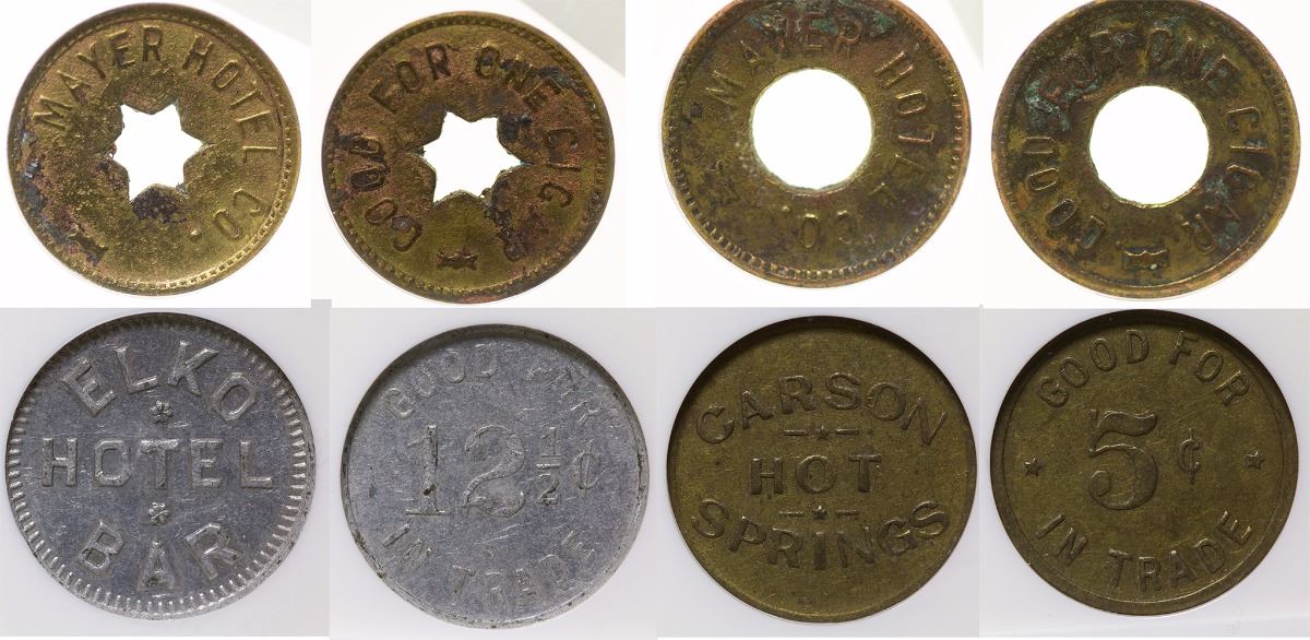 Lot of 4: 1) Obv.: Mayer Hotel Co.; Rev.: Good For One Cigar; Rd. Br., star cutout, 20mm, NCS; 2) Obv.: Mayer Hotel Co.; Rev.: Good For One Cigar; Rd., Br., circle cutout, 20mm, NCS. 3) Obv.: Carson / Hot / Springs; Rev.: Good For / 5c / In Trade; Rd., Br., 20mm, NGC XF 45. 2) Obv.: Elko / Hotel / Bar; Rev.: Good For / 12 1/2c / In Trade; Rd., wm, 20mm, NGC AU 50. City: Elko / Carson City State: Nevada Date: hwac# 36012