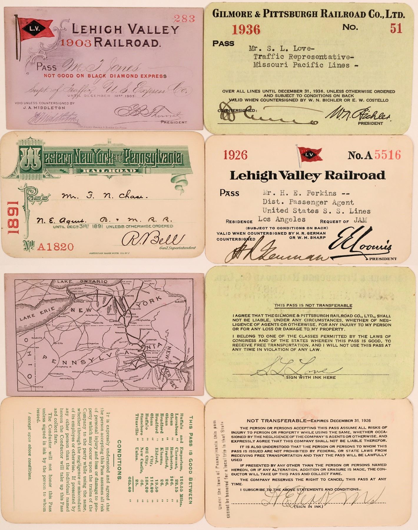 Lot of 4, three different railroads. 1) Western New York and Pennsylvania Railroad. Issued in 1891. Nice design with fancy green logo. 2) Lehigh Valley Railroad. Two passes: 1903 (purple with map of route on reverse) and 1926 (with flag logo). 3) Gilmore & Pittsburgh Railroad Co., Ltd. Issued in 1936.