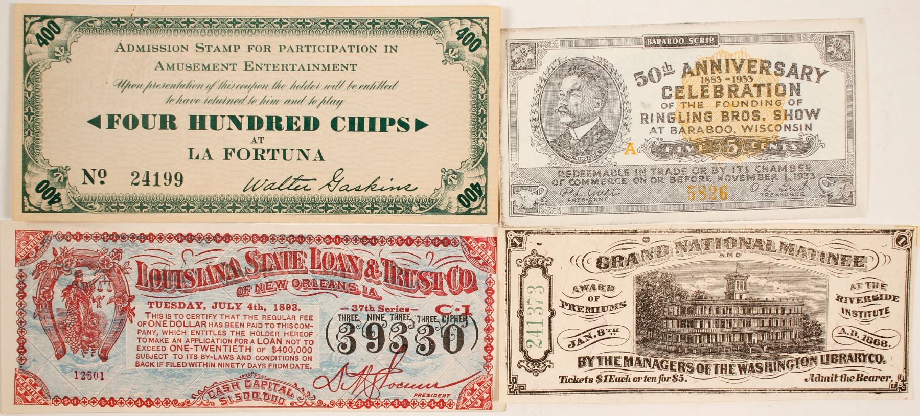1) Baraboo Scrip, 50th Anniversary Celebration, 1883-1933, of the Founding of Ringling Bros. Show at Baraboo, Wisconsin. GF 5 cents. 2) Louisiana State Loan & Trust Co. of New Orleans, LA. July 4th, 1893. One Dollar Paid which entitles holder to make an application for a loan not to exceed 1/20 of $400,000. 3) American Exposition, San Diego, 1935, good for 400 chips at La Fortuna. 4) 1868 ticket for the Grand National Matinee by the managers of the Washington Library Co. at the Riverside Institute.