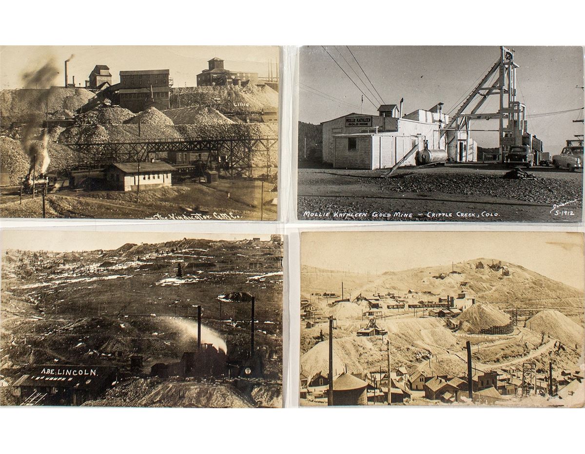1) The Vindicator Gold Mining Company. Shows a steam engine leaving the mine. Postmarked 1909. 2) Mollie Kathleen Gold Mine. S-192. Photo by Sanborn. 3) The Abe Lincoln Mine. The name is written on the roof of a building. One can see two hose spraying water at this placer mine. 4) Overview of a mine and city buildings. Not identified. Fabulous group of views! (Prag Collection)