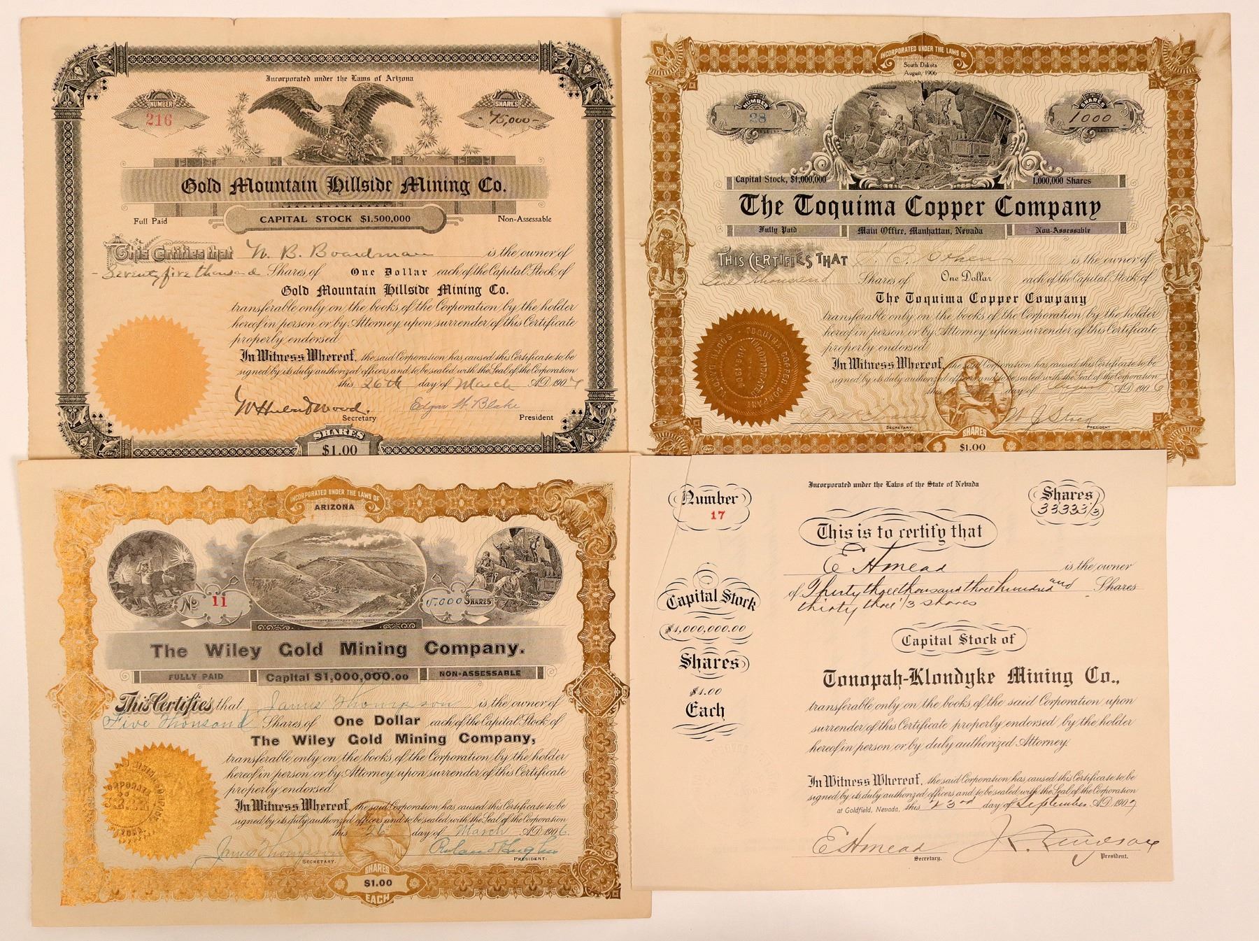 Stocks include Toquima Copper Co. 1906, offices in Manhattan, NV. ; Tonopah Klondyke Mining Co. 1907; Wiley Gold Mining Co. 1906, mines at Lida, Nevada and Gold Mountain Hillside Mining Co. 1907, mines possibly at Lida.