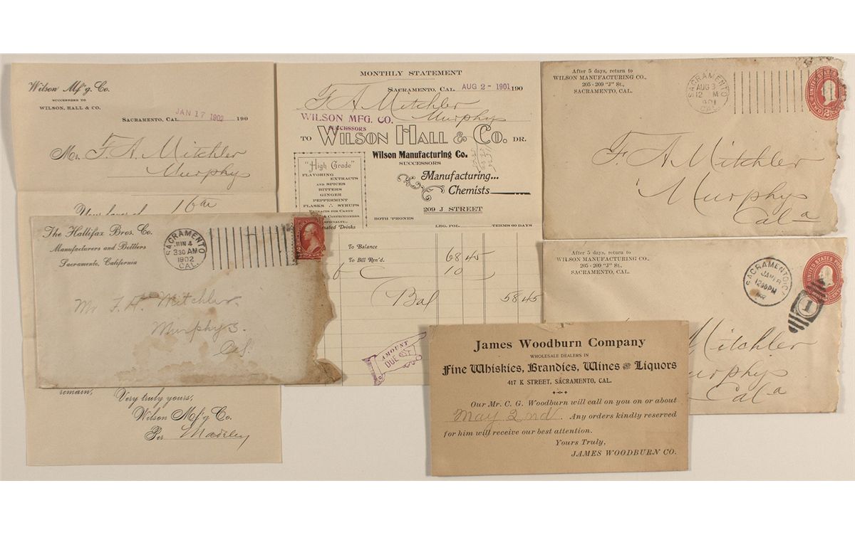 1) 1901 James Woodburn fine whiskies postal. 2) 1902 Halifax advertising corner, 3-4) Two 1901/2 Wilson Hall Manufacturing with billhead.City: SacramentoCounty: SacramentoState: CADate: