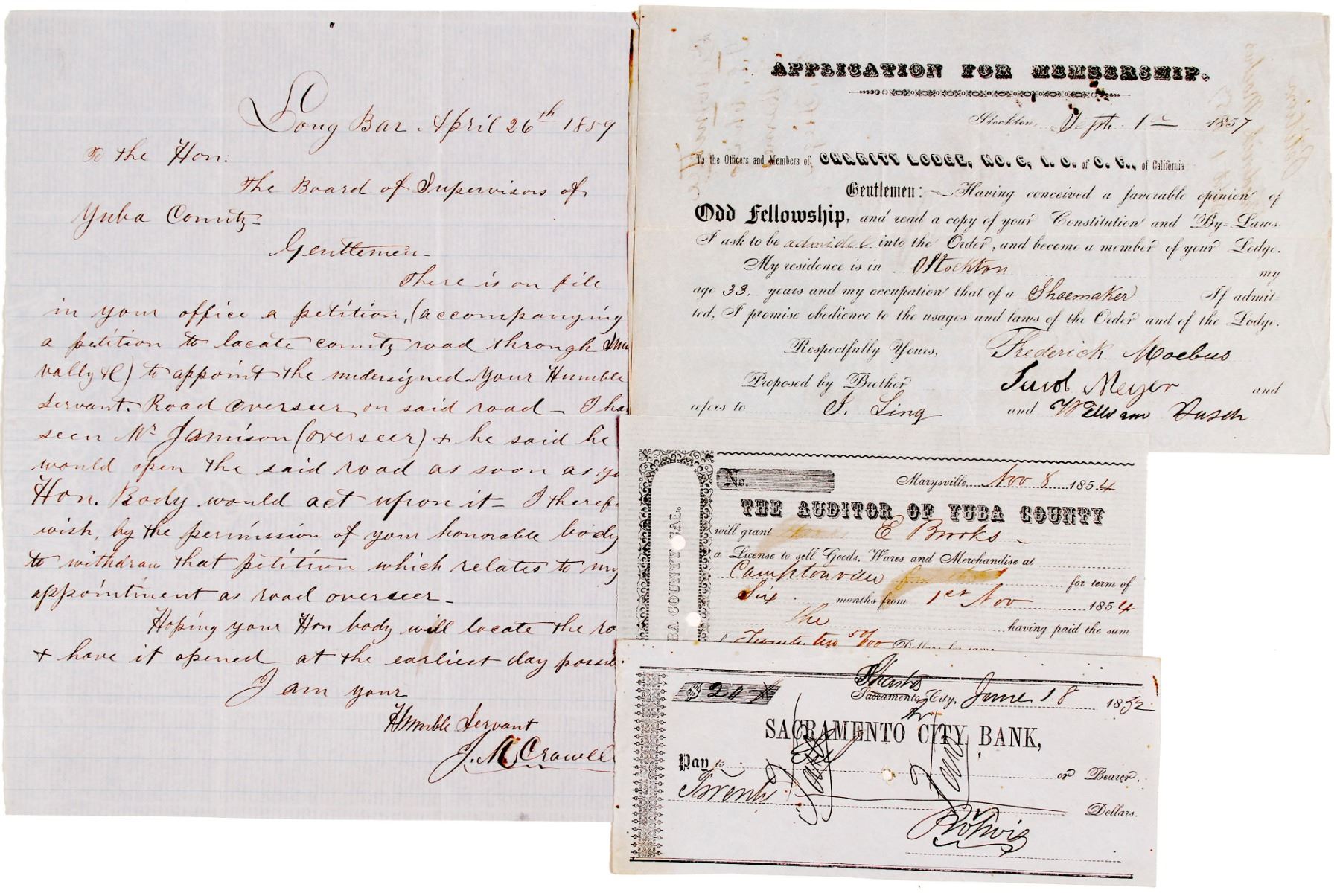 Nice group of four. 1)Letter datelined Long Bar, April 26, 1859 addressed to the Board of Supervisors of Yuba County. Content regards a petition to locate a county road through Smith's Valley and appoint the letter writer as road overseer. J.M. Crowell withdraws his petition as overseer, and hopes the road will open at the earliest day possible. Signed, Humble Servant, J.M. Crowell. The first gold found on the Yuba River was in 1848. The post office was transferred from Dry Creek in 1859, and the diggins gave out in 1864 (Gudde). 2) Business licence to sell general goods dated Marysville, Nov. 8, 1854. E. Brooks was to sell goods, wares and merchandise in Camptonville. License was from The Auditor of Yuba County. 3) Sept. 1, 1857 Application for membership in the Stockton, Cal. I.O.O.F., Charity Lodge #6. Signed by Frederick Moebus, the applicant, proposed by Brother, Jacob Meyer. 4) Sacramento City Bank Check, datelined Shasta, June 18, 1852. Nice group in fine condition.