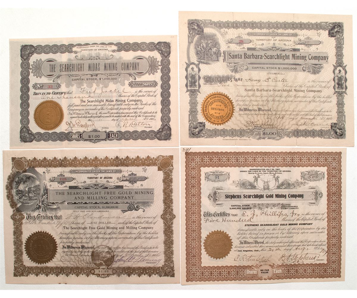 1) Stephens Searchlight Gold Mining Company, #91 for 500 shares to E. J. Phillips Jr. in 1907. 2) Santa Barbara-Searchlight Mining Company, #28 for 3 shares to Henry E Carter in 1906. 3) Searchlight Midas Mining Company, #32 for 1000 shares to Fred Jackel in 1906. 4) Searchlight Free Gold Mining and Milling Company, #128 for 1250 shares to HH Clondman in 1906. These are all early stock certificate numbers. All were incorporated in the Territory of Arizona which was just over the border. Between 1907 and 1910 the mines produced about $10,000,000. Searchlight's most famous citizen is Senator Harry Reid the ranking Democrat in the Senate.
