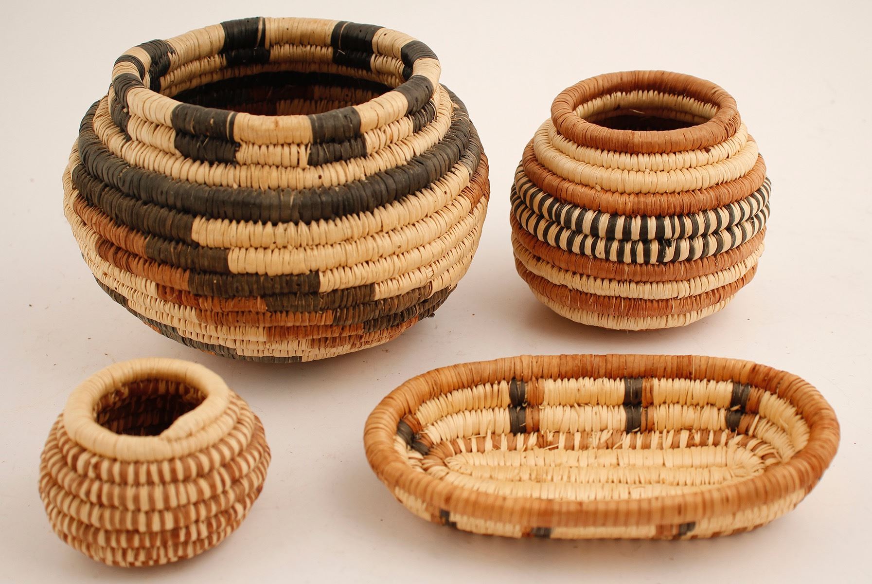 Lot includes four baskets: 1) 4.25" h x 6.25" diameter. 2) 3.5" h x 4" diameter. 3) 2" h x 2.75" diameter. 4) oval basket, 6" x 3.25" x 1.25". These baskets are woven from all natural desert materials. Seri women create their exquisite baskets from the gathering of raw desert plants through the finished basket, entirely by hand. They are totally organic in every sense of the word and can take weeks, months, or even years to complete. The Seri women work entirely from memory, neither needing nor using a pattern to create these works of art. (courtesy seriindianarts.com) Date: Location: Sonora, zMexico HWAC# 63875