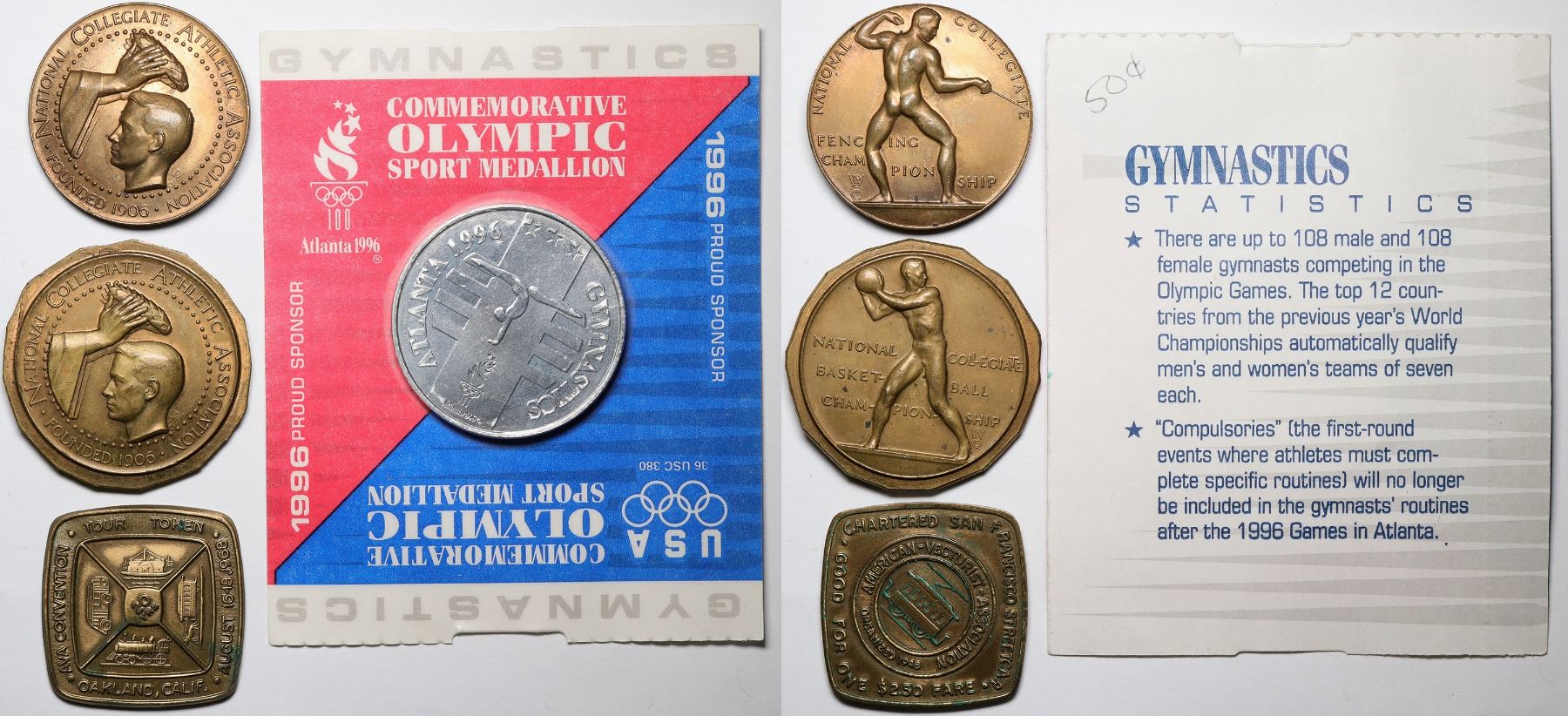 Lot of four medals from the 1900s. Includes Atlanta 1996 USA Commemorative Olympic Sport Medallion for gymnastics, still in package. Silver metal, 1-1/2 inch diameter, with gymnast and olympic torch; two 1-1/2 inch diameter bronze National Collegiate Athletic Association medals for fencing and basketball championships; and square shaped 1-1/4 x 1-1/4 inch brass American Vecturist Association Chartered San Francisco Streetcar $2.50 in fare commemorative tour token for the AVA Convention in Oakland, CA, August 16-18, 1968. See photo for details.