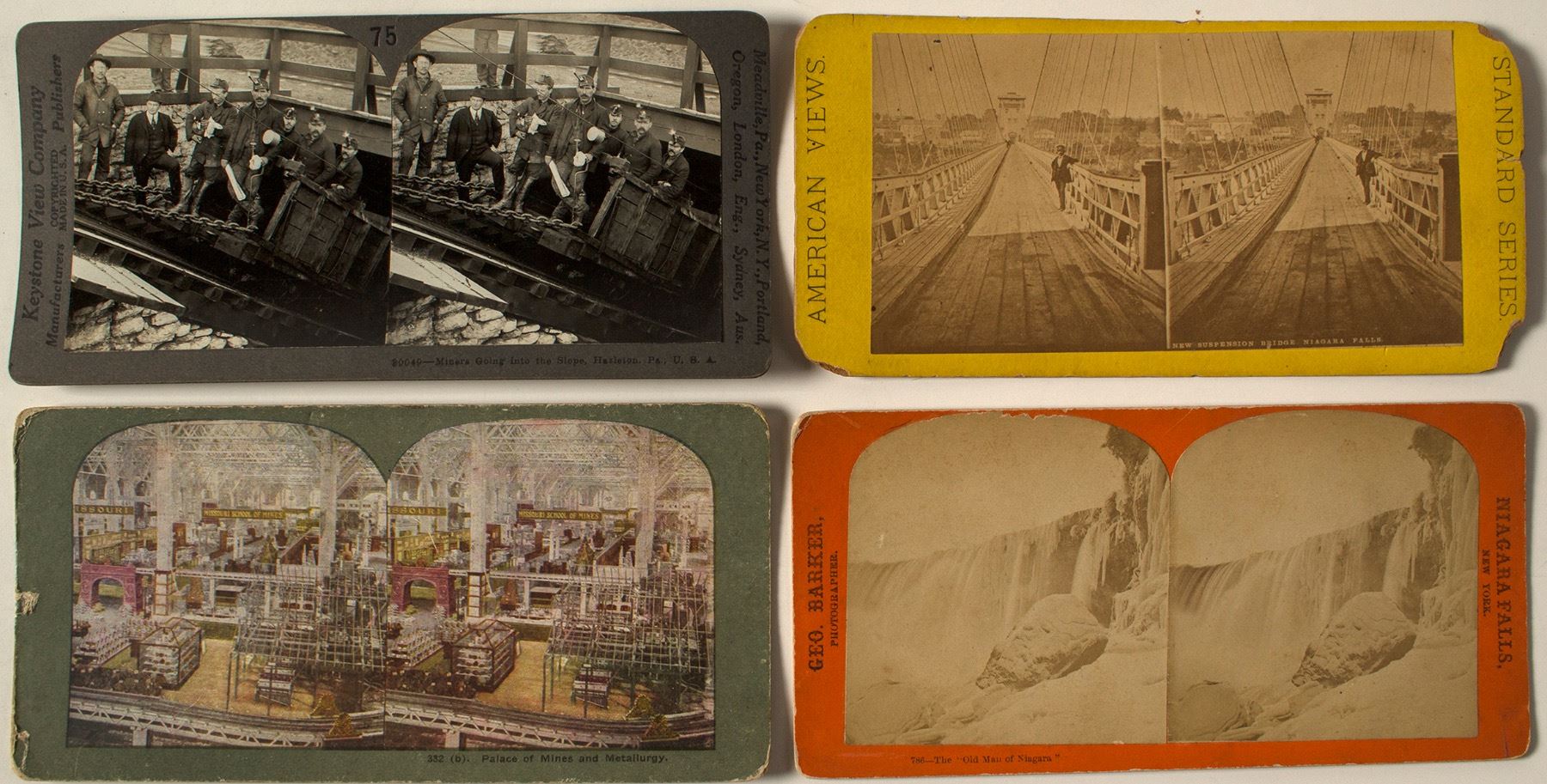 Four stereoviews: 1) Miners going into the Slope, Hazleton, PA. 2) Palace of Mines and Metallurgy. 3) Niagara Falls. 4) New Suspension Bridge, Niagara Falls. Date: Location: New York HWAC# 46776