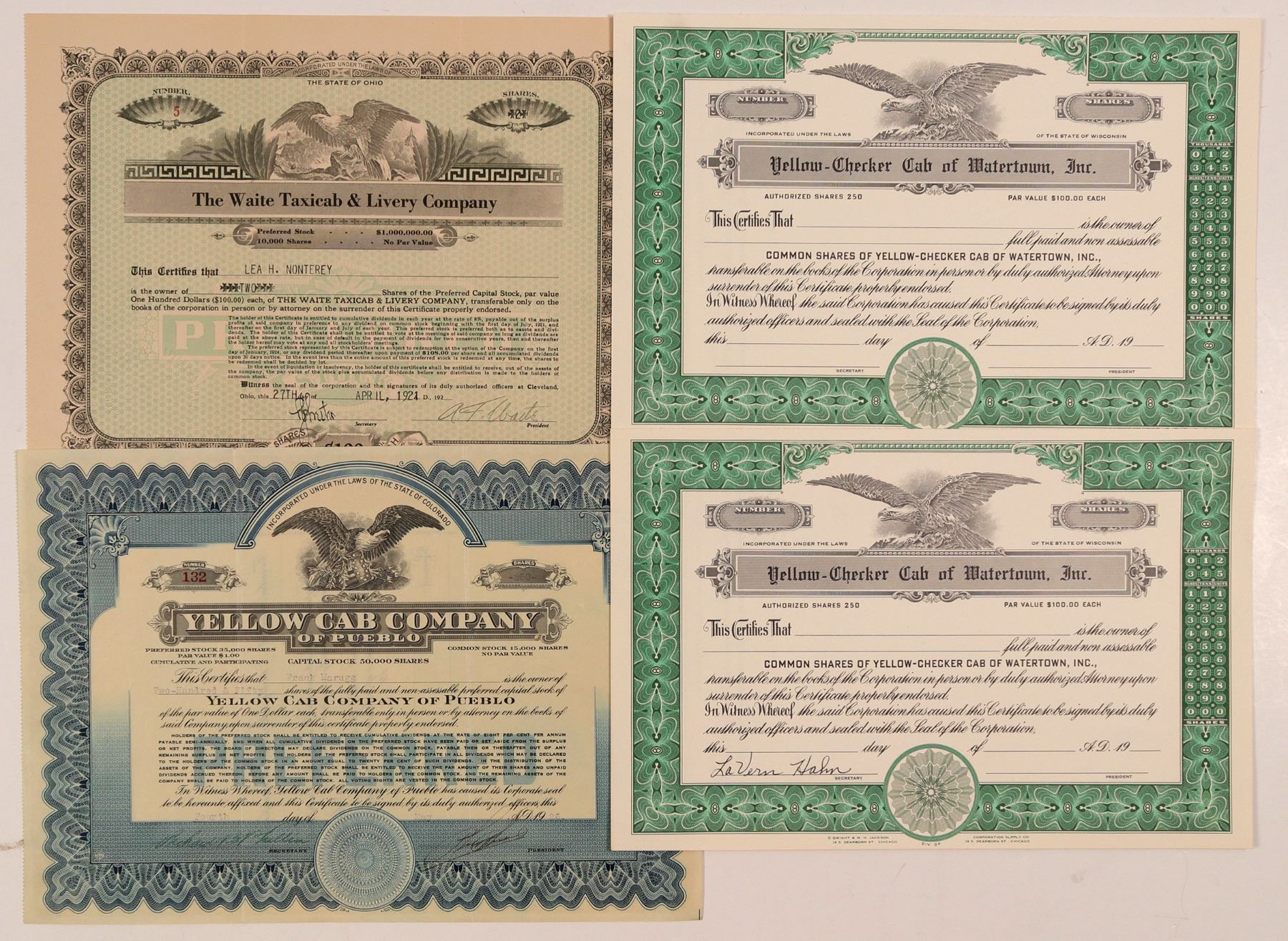 Lot of 4. 1) Waite Taxicab & Livery Company. Inc. in Ohio. Issued in 1921, not cancelled. Eagle vignette. 2) Yellow Cab Company of Pueblo. Inc. in Colorado. Issued in 1926, not cancelled. Eagle vignette. 3) Yellow-Checker Cab of Watertown, Inc. Inc. in Wisconsin. Two unissued stocks. Eagle vignette. Good condition. Ken Prag Collection