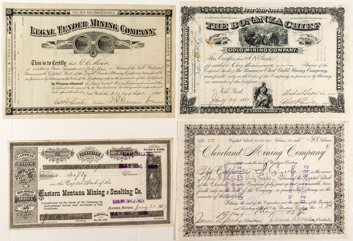 1) Eastern Montana Mining & Smelting Co. Location: Clark's Fork, Wyoming Territory. Mining vignette. Issued 1877 in Bozeman. Stamp cancelled. 2) Cleveland Mining Company. Issued in Butte City, 1880. Stamp cancelled. 3) The Bonanza Chief Gold Mining Company. Issued 1881. Stamp cancelled. Mining & Native American vignette. 4) Legal Tender Mining Company. Issued 1885. Not cancelled. (Prag Collection) City: State: Montana Date: 1877-1885 HWAC# 34114