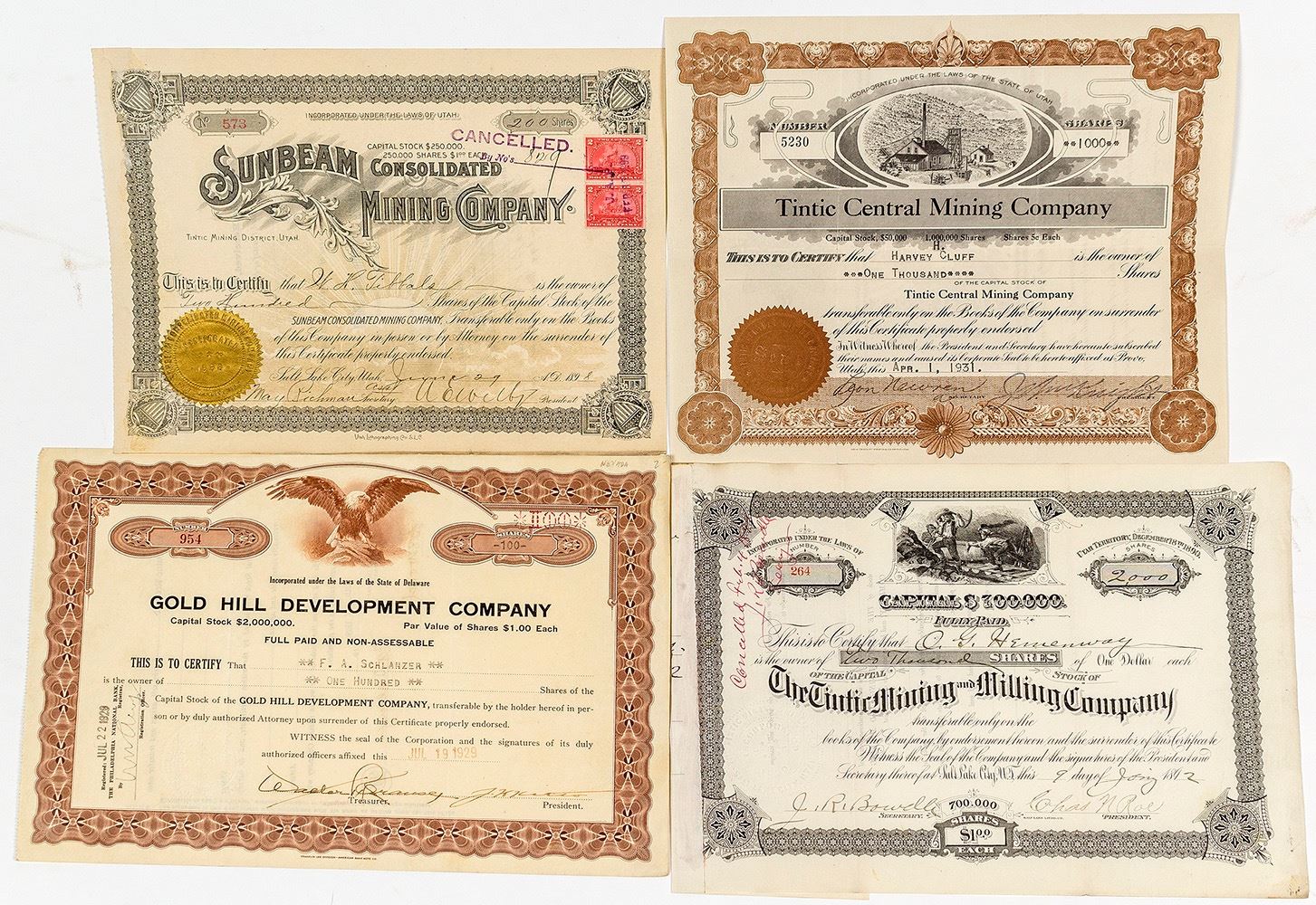 Lot of 4 different. Included: Tintic Central Mining Company (1931, not cancelled, mine vignette), Sunbeam Consolidated Mining Company (1898, stamp cancelled), The Tintic Mining & Milling Company (1892, pen cancelled, mining vignette), and Gold Hill Development Company (1929, not cancelled, eagle vignette). Date: 1892-1931 Location: Tintic Mining District, Utah HWAC# 43010