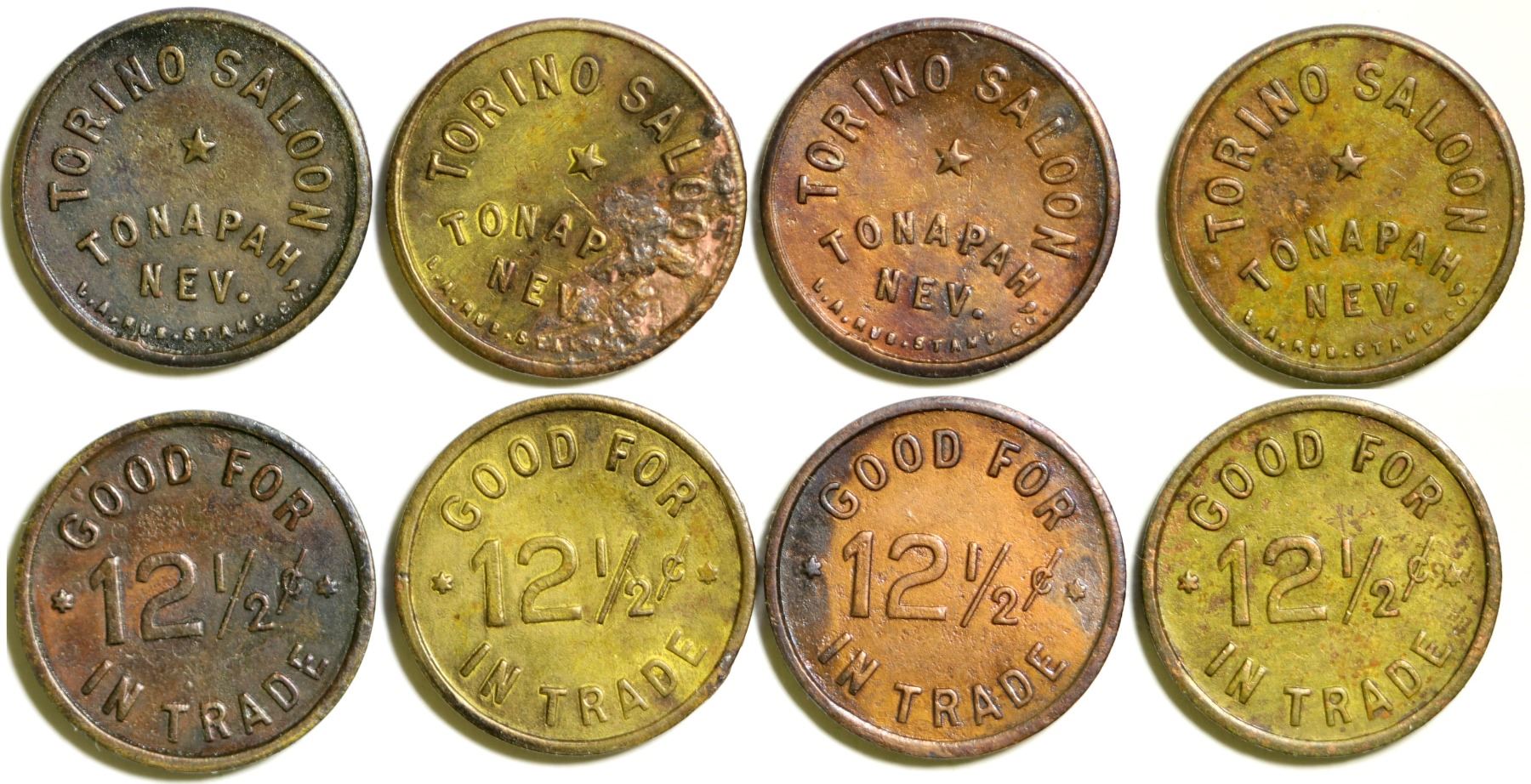Four Nevada tokens starting at $10.00!!! Torino Saloon / Tonopah / Nev. /// Gf 12 1/2c IT. Round. Brass. Condition varies with a couple of very nice examples.
