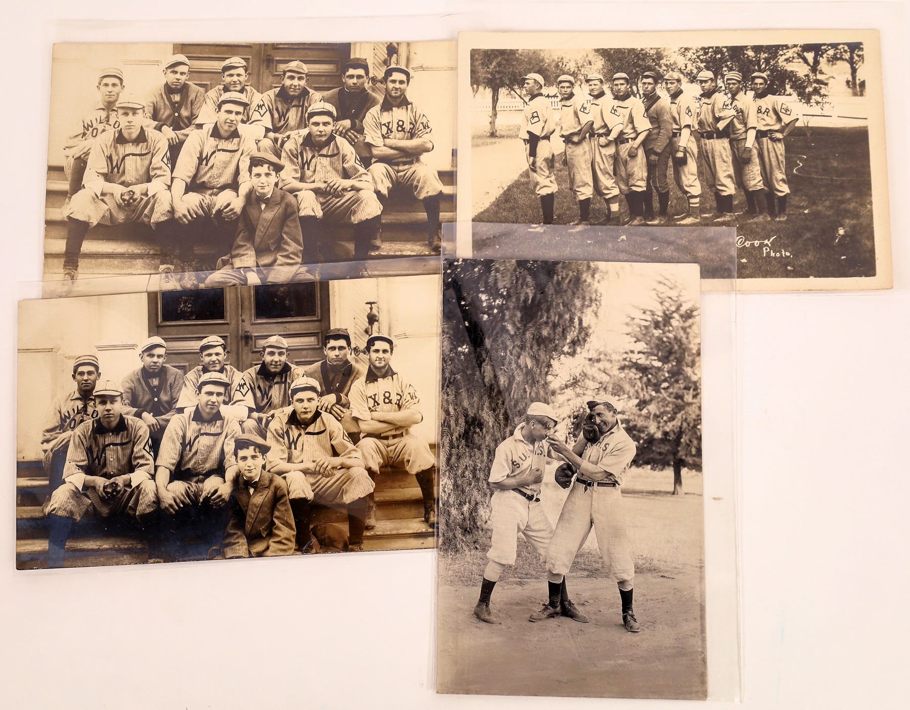 Four unique RPC's featuring small town baseball teams. Included are two teams (One duplicate) from Woodland, California. they look a little old to be a youth team. Our guess is a town team. The fourth one is also of town team players rough housing. These kids are from the Sutter Creek team, according to the writing on the card. A great slice of Americana.