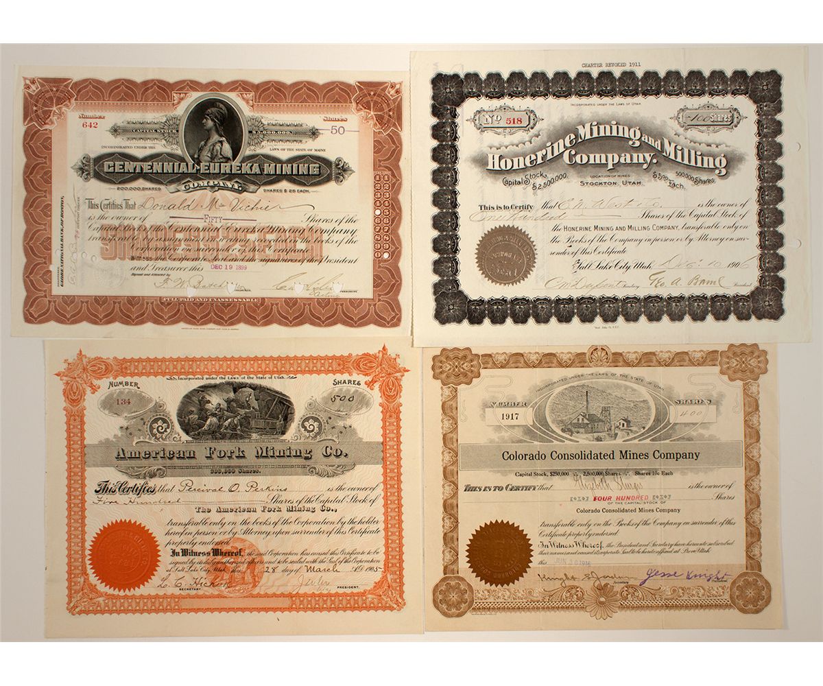 Four certificates from different miners issued between 1899 and 1916. 1)Centennial Eureka Mining Company (ME), issued in 1899 for 50 shares. Signed by the president (illeg) and the secretary F.W. Batchelor. The company organized in 1876 in Utah, but later incorporated in Maine. Mine office was at Eureka. Lands in the Tintic district included the Centennial, Eureka, Tintic, Dove, Swan and Pelican groups. The oxidized ores carried high values of gold and silver, but their was an enormous amount of lo grade ore at the site. The company employed 300 men in 1907, when their production totaled 2310 carloads of ore or 80,000 tons (1908 Copper Handbook). Hole cxls. 2)American Fork Mining Co. (UT), issued in 1905 for 500 shares. The American Fork district is in Utah County in the Wasatch mtns. This company was not listed in the 1908 Copper Handbook. Unc. 3)Honerine Mining and Milling Company (UT), issued in 1906 for 100 shares. Their ore was mostly silver-lead with copper as a by-product. Had a 10,800' drainage and transportation tunnel which cost $1 million. Along with it's twin, the Honerine Tunnel and Mining Co., they owed over $220,000 in debt in 1908, and were to be sold by the sheriff (1908 C.H.) Two holes punched at right. 4)Colorado Consolidated Mines Company (UT), issued at Provo, Ut. in 1916. Signed by Jesse Knight as president. The company held 28 claims near the Sioux Consolidated in the Tintic district, Juab County. Had a large deposit of low grade ore with silver, gold, lead and copper values (M.H. 1918). Their main shaft was 2,000' underground. Unc.City: County: State: UTDate: