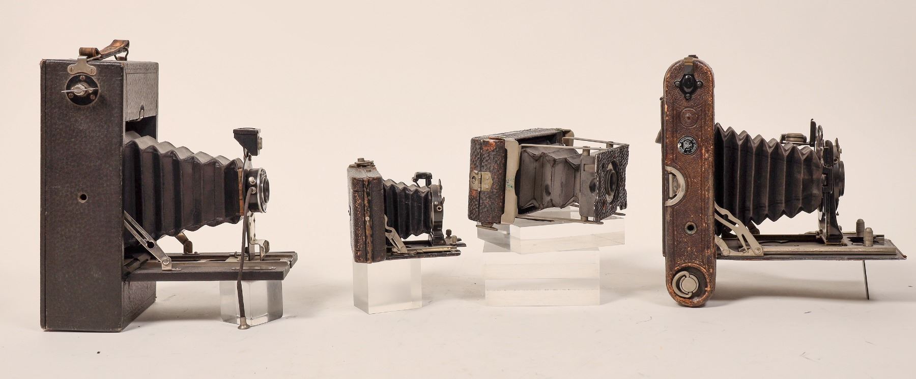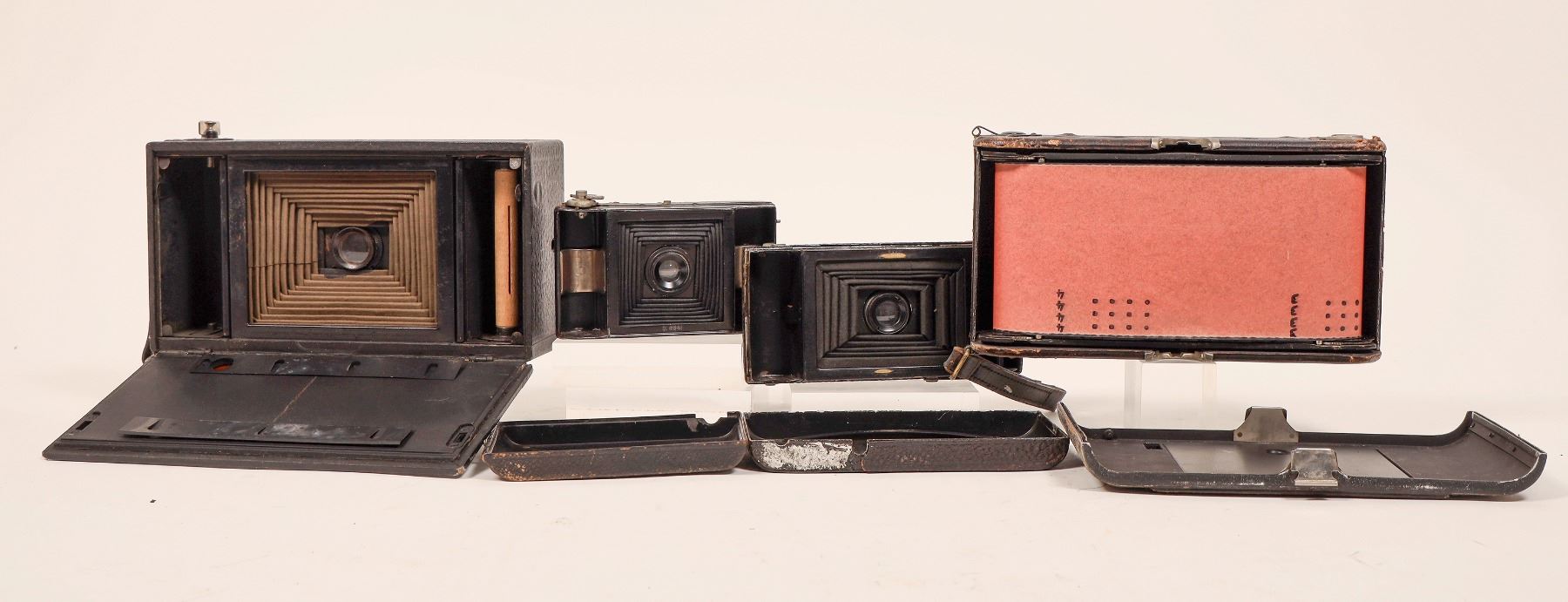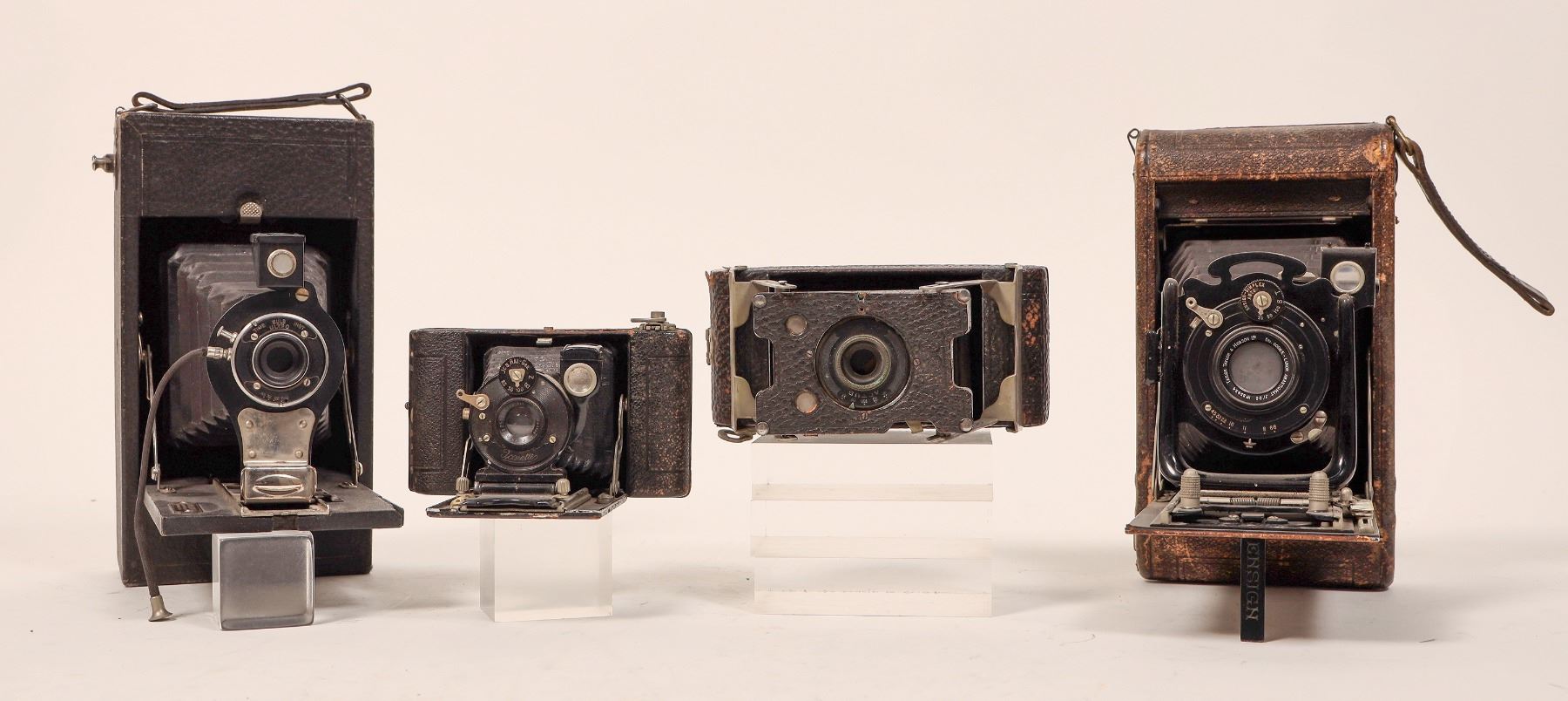 4 vintage cameras. Actus with some leather loss. Icarette. Ensign. Conkley folding Kewpie. Not tested.