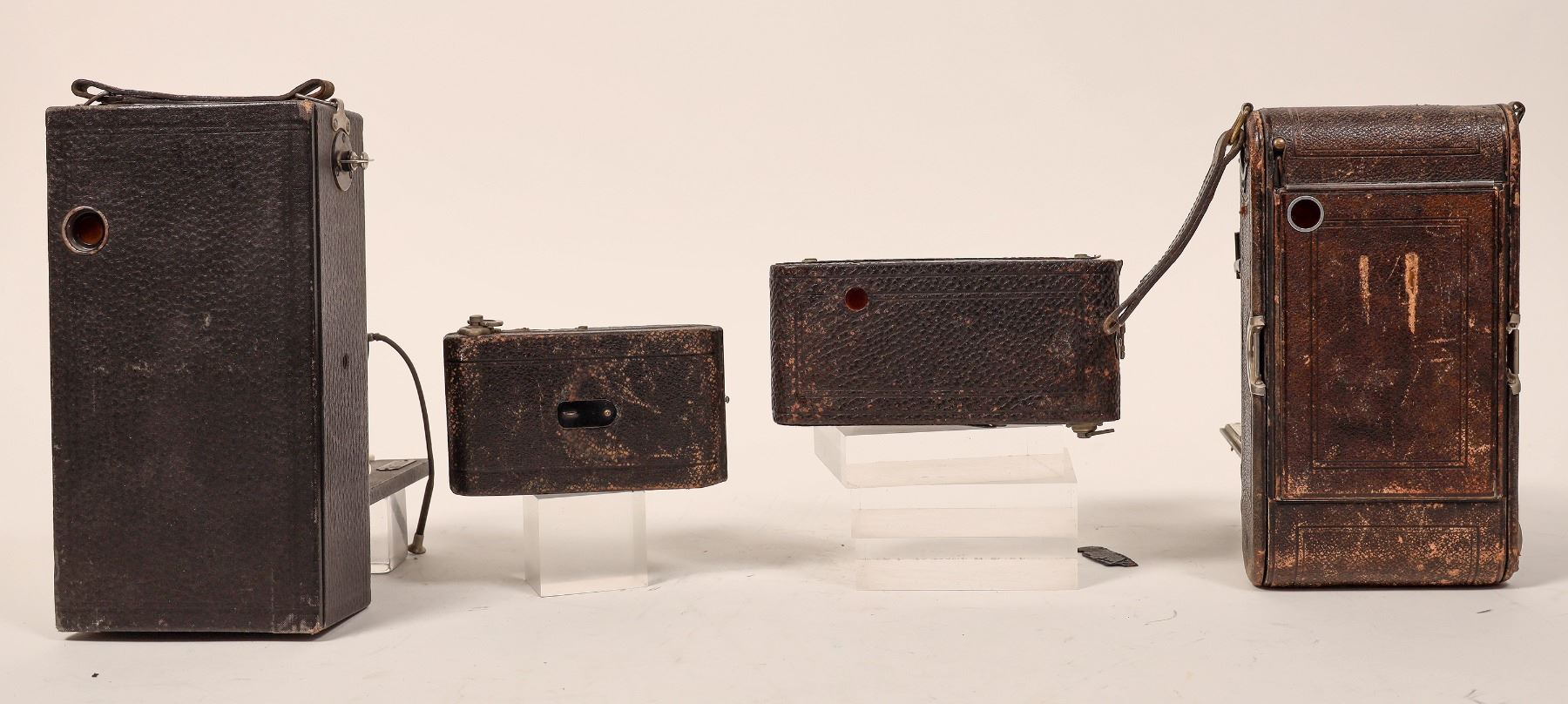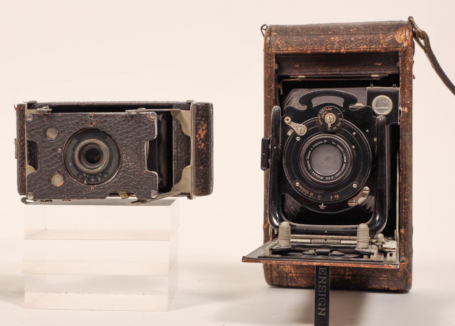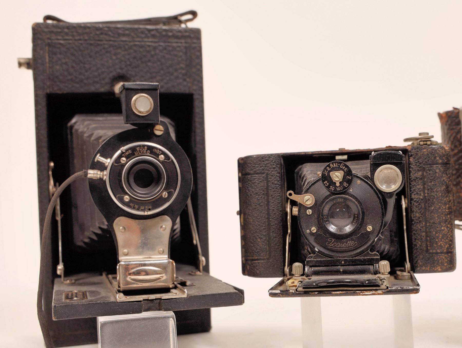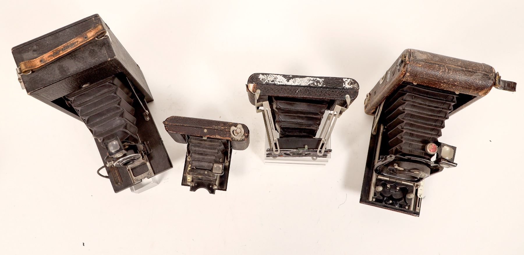 4 vintage cameras. Actus with some leather loss. Icarette. Ensign. Conkley folding Kewpie. Not tested.
