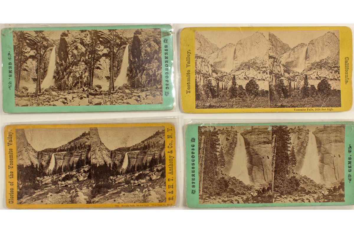 Four stereoscopics of Yosemite waterfalls, including Yosemite Falls and Nevada Fall, by E. & H. T. Anthony & Co., N. Y. From the Burger collection.