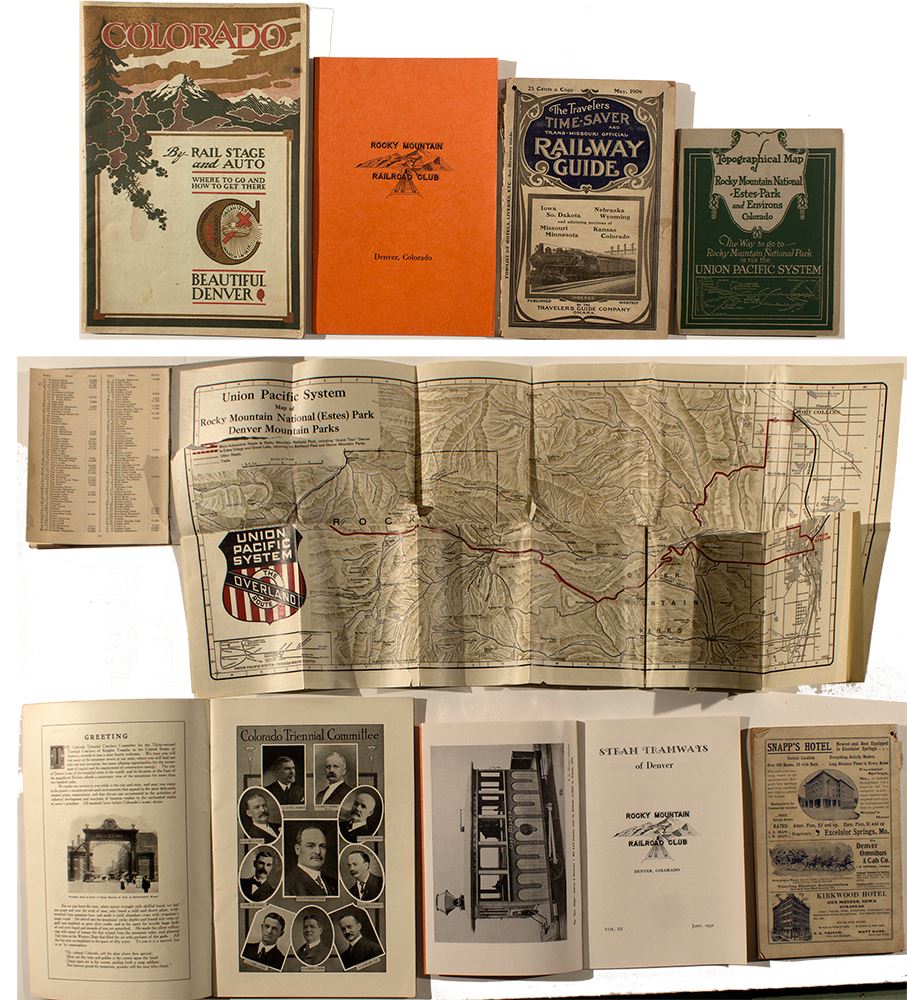 1) Topographical Map of Rocky Mountain National Estes Par and Environs. 2) Rocky Mountain Railroad Club, 1950. 3) The Travelers Time-Saver and Trans-Missouri Railway Guide for Iowa, South Dakota, Nebraska, Wyoming, Missouri, Minnesota, Kansas, and Colorado. 1909. Blue Book. 4) Colorado by rail, Stage and Auto. c1910.