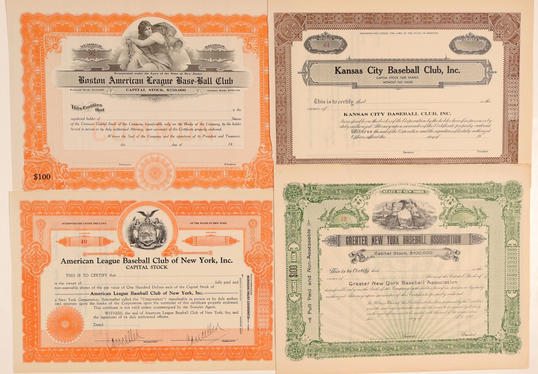 1) Boston American League Base-Ball Club. # 92. 2) American League Baseball Club of New York, Inc. # 40. 3) Kansas City Baseball Club, In. # 64. 4) Greater New York Baseball Association. # 19. Ken Prag Collection