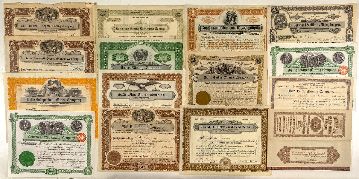14 stocks: two Butte Ramsdell Copper Mining Co., no. 12, 2500 shares, 1919, cancelled and no. 420, 1000 shares, 1920, cancelled; Butte Independent Mines Co., no. 341, 2000 shares, 1928; Butte Mining Co., Bob Hill Mining Co., no. 7, 250 shares, 1918; no. 1935, 1000 shares, 1931; Bald Butte Gold Mines, no. 5468, 1000 shares, 1954; Bald Butte Mining Co., no. 832, 100 shares, 1901; Butte Olive Branch Mines Co., no. 572, 100 shares, 1929; British Butte Mining Co., no. 1975, 50 shares, 1907; and more. City: Butte State: Montana Date: ID: 36638