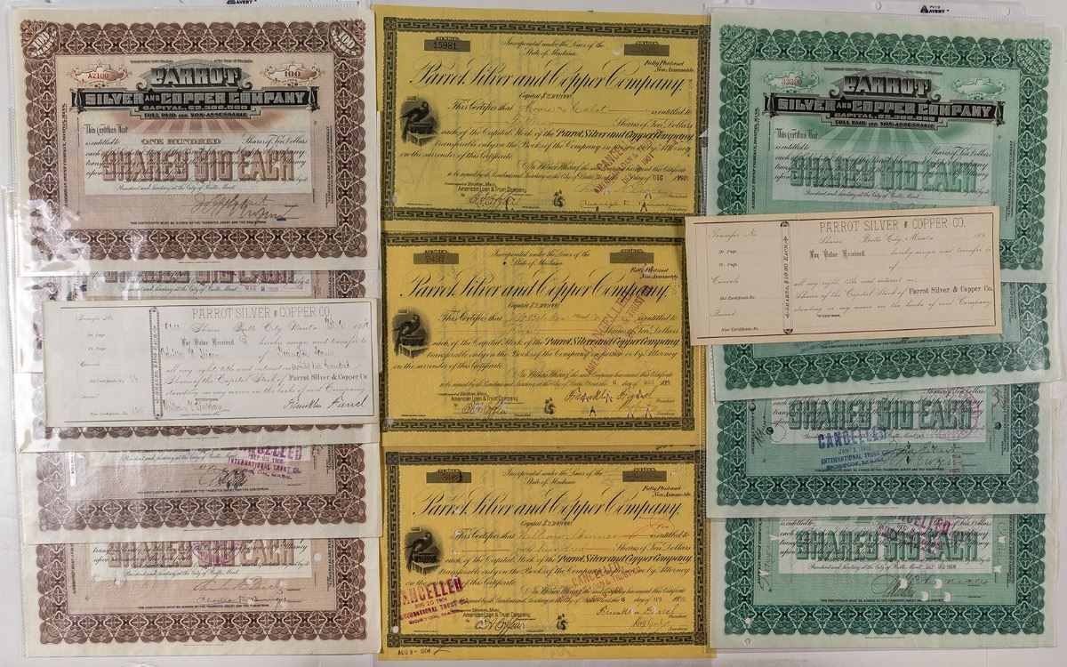 Parrot Silver and Copper Company. Dates range from 1886-1911. The earliest stock, no. 116 (125), 7200 shares, 1886. All are cancelled except this one. Three stocks are unissued. Great group. City: Butte State: Montana Date: ID: 36226