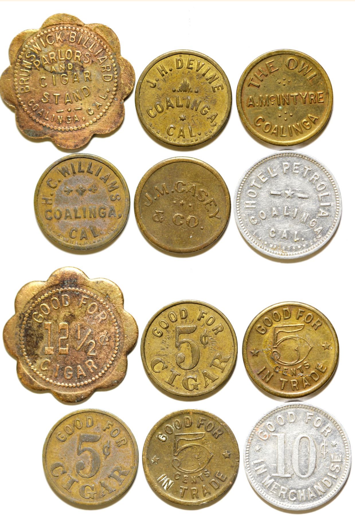 Lot of six tokens: Hotel Petrolia; J. M Casey; J. H. Devine; H.C. Williams; The Owl; Brunswick Billiard. Daniel Manassillian Collection. State: California City: Coalinga Date: HWAC# 84365
