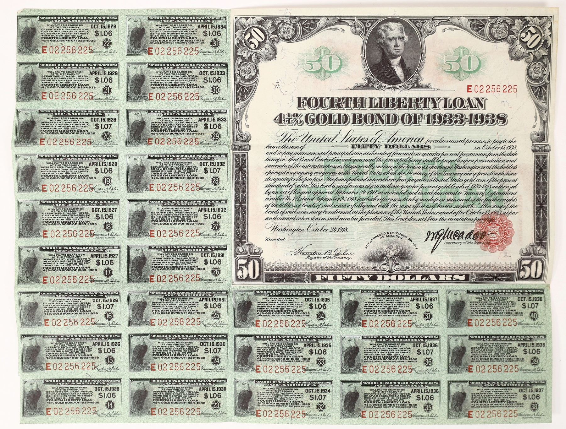 Fourth Liberty Loan 4 1/4% Gold Bond of 1933-1938 $50 Oct. 24, 1918 S/N E02256225 A great looking and a "Repeater" Extra Fine Gold Bond with coupons numbered 14-40 still attached. Vivid color, deep embossing, and only "as-made" folds are noted on this attractive artifact of our war effort.