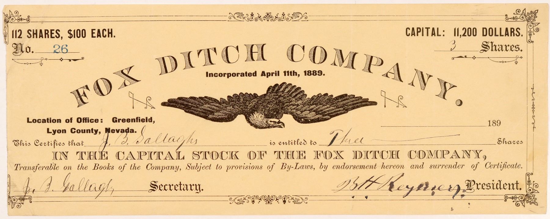 Location of Office: Greenfield, Lyon County, Nevada. Greenfield was the first name for Yerington. Extra rare! Inc. April 11th, 1889. No. 26, issued for 3 shares to secretary JB Gallagher. Not dated. Also signed by the president (BH Reymers). Not cancelled. Black print on yellow paper. Eagle vignette. 4 x 10" Left border trimmed. Folds. Named changed to Yerington in 1894. Ken Prag Collection