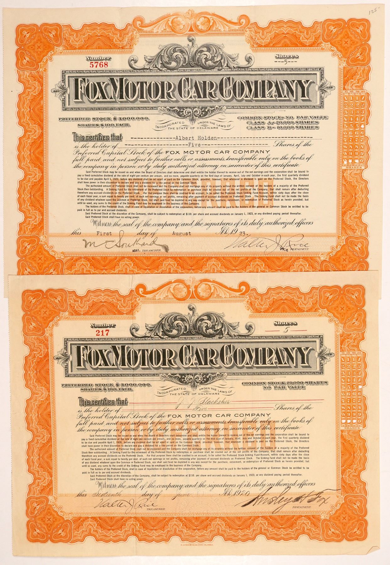 Lot of 2, issued in 1920 and 1923. Walter J. Rice signs as treasurer on the earlier stock and vice-president on the later. Both not cancelled. Orange border, black print. E.A. Wright Bank Note Co., Philadelphia. 9 x 12" Folds, light wear. The Fox Motor Company was founded by Ansley H. Fox, inventor of the Fox Shotgun. The company operated in Philadelphia from 1921-23. Their cars featured air-cooled engines. Ken Prag Collection