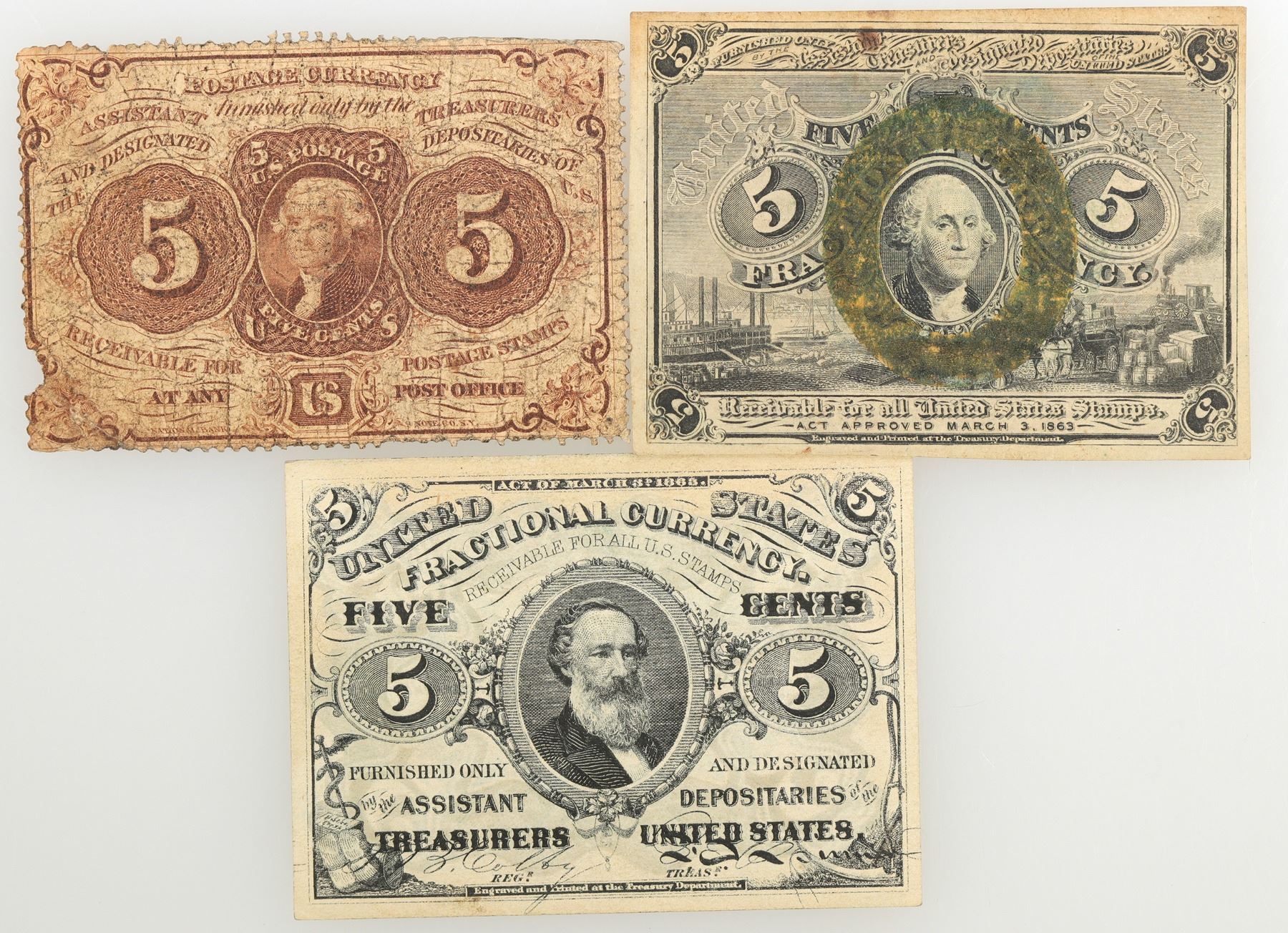 Lot of three five cent fractional currency pieces: 1) FR#1232 5c Second Issue, AU; 2) FR#1238, 5c Third Issue, CU 63; 3) FR# 1229 5c First Issue, AG.