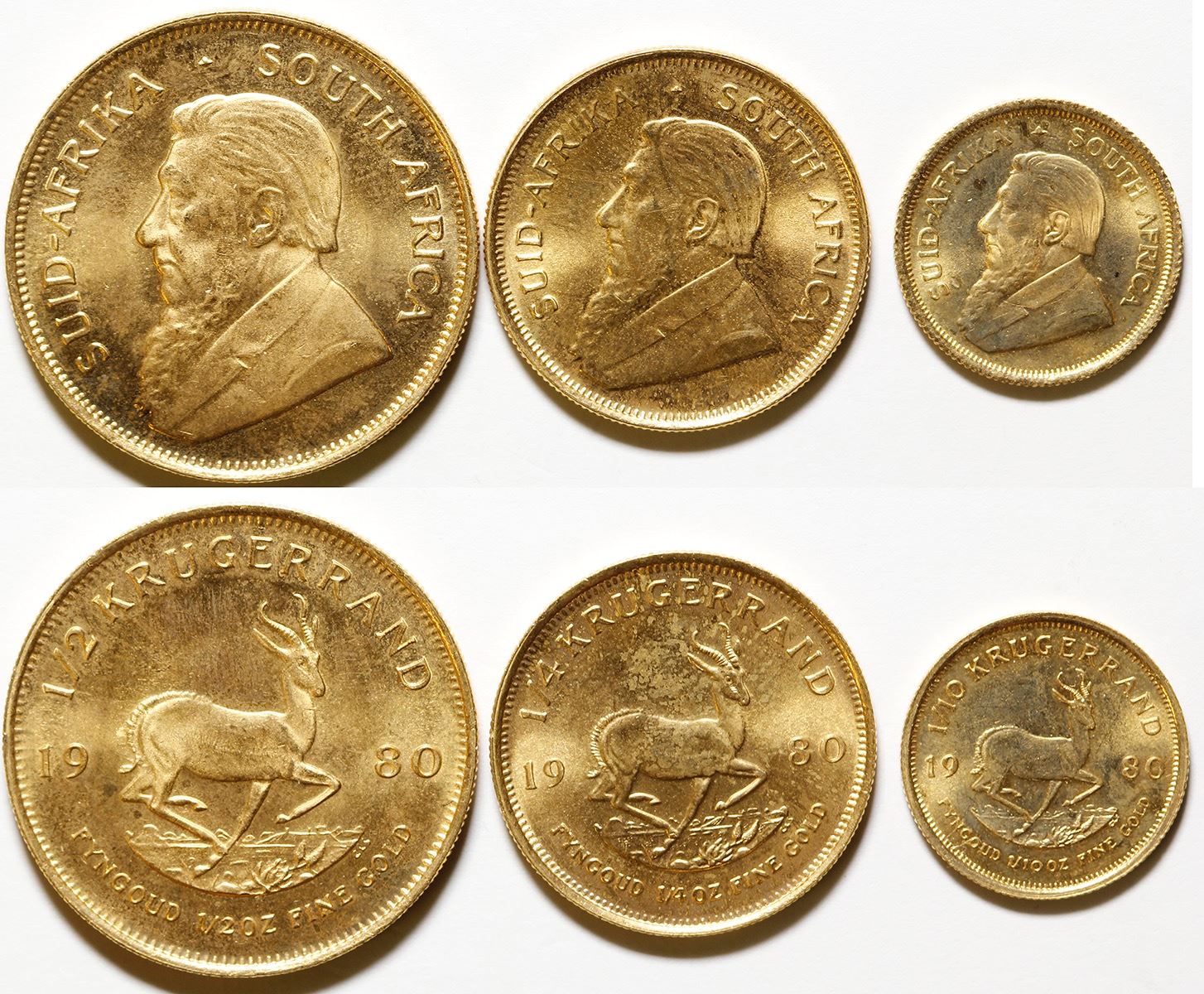 Lot of three sizes of uncirculated 1980 South African Gold Krugerrand coins: 1/10 ounce, 1/4 ounce, and 1/2 ounce.