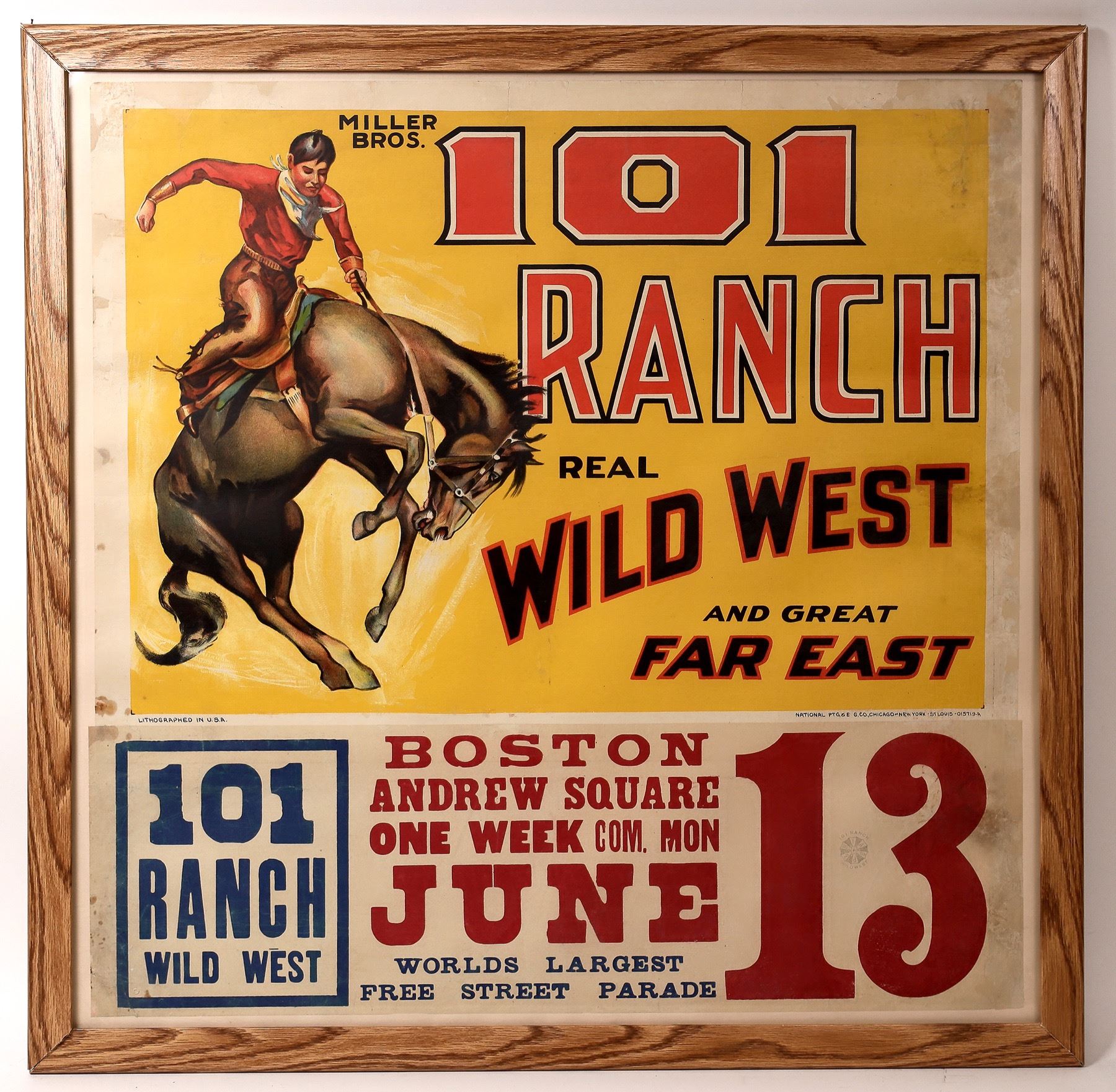 2 part lithograph. Miller Bros. 101 Ranch, Real Wild West and Great Far East, Boston, June 13. Cowboy riding a bronc. Frame 32x22". Some edge toning.