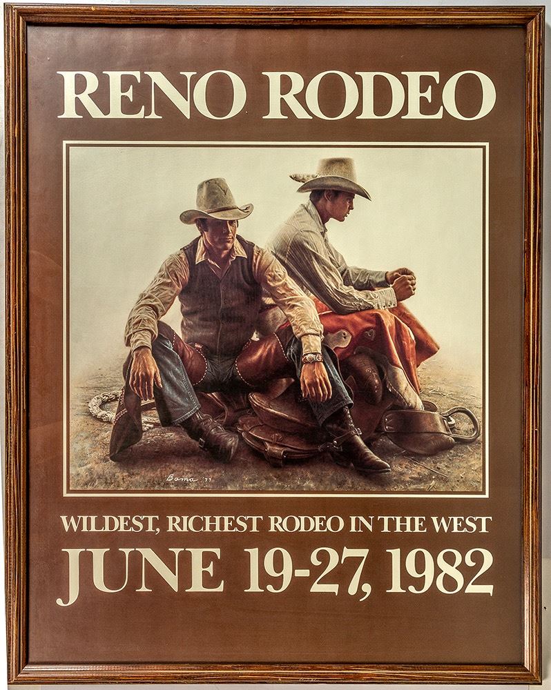 Framed poster in wood frame. Frame measures 29.5" x 24". RENO RODEO/ WILDEST RICHEST RODEO IN THE WEST/ JUNE 19-27, 1982. Depicts 2 cowboys sitting on saddles. Art print is by Bama '77. State: City: Date: ID# 50227