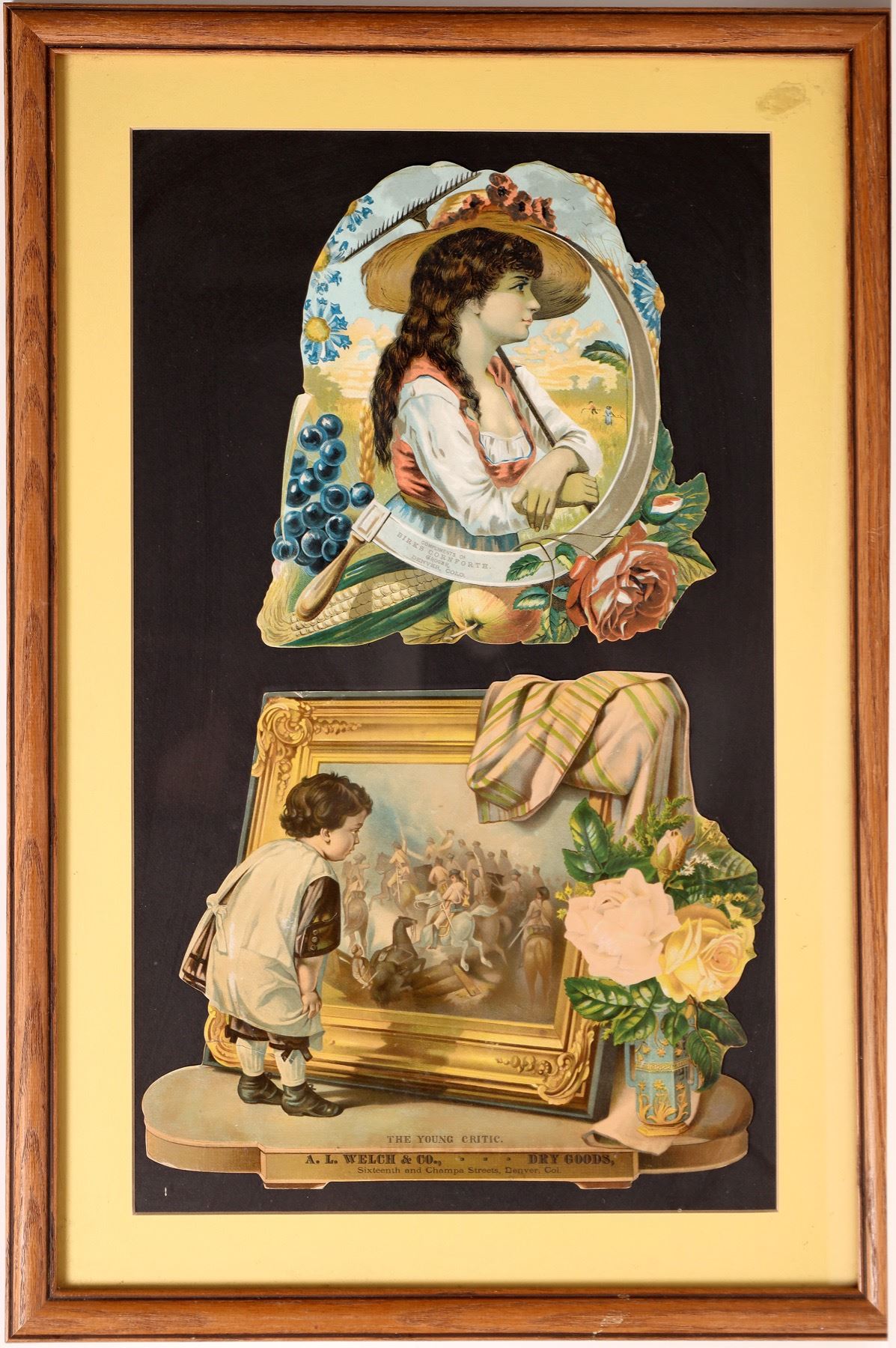 Frame with two advertising die cuts for businesses in Colorado. The one on the top is for Birks Cornforth, Grocer, Denver, Colorado. It features a young girl wearing a sun hat, surrounded by produce. The die cut on the bottom is for A.L. Welch & Co., Dry Goods, Sixteenth and Champa Streets, Denver, Colorado. Features an image of a boy looking at a painting titled "The Young Critic." These die cuts are nicely matted and framed. Overall size is 16 x 23.75 inches, good condition.