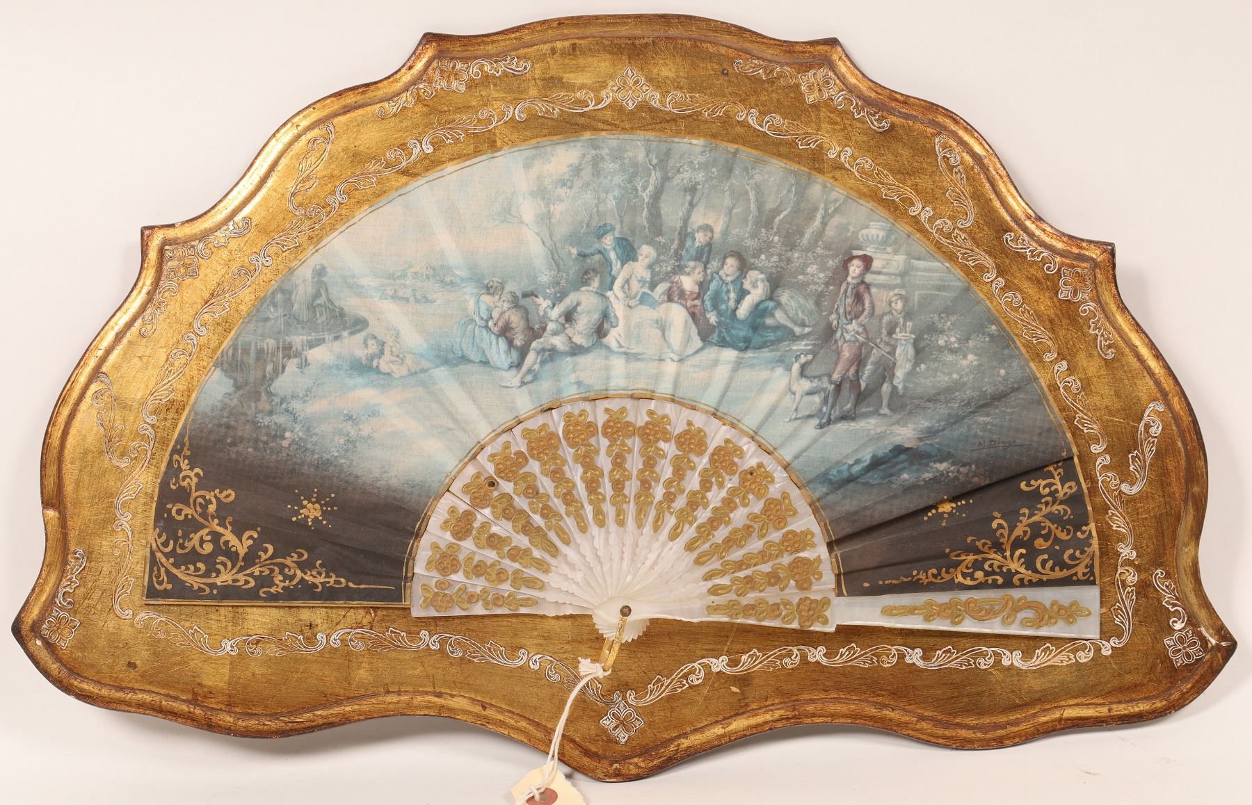 This is the style used to present antiquarian fans, spread open and adhered to a fancy guilt carved backing. This piece is 21" long and 14" tall, probably contemporary made to look old.