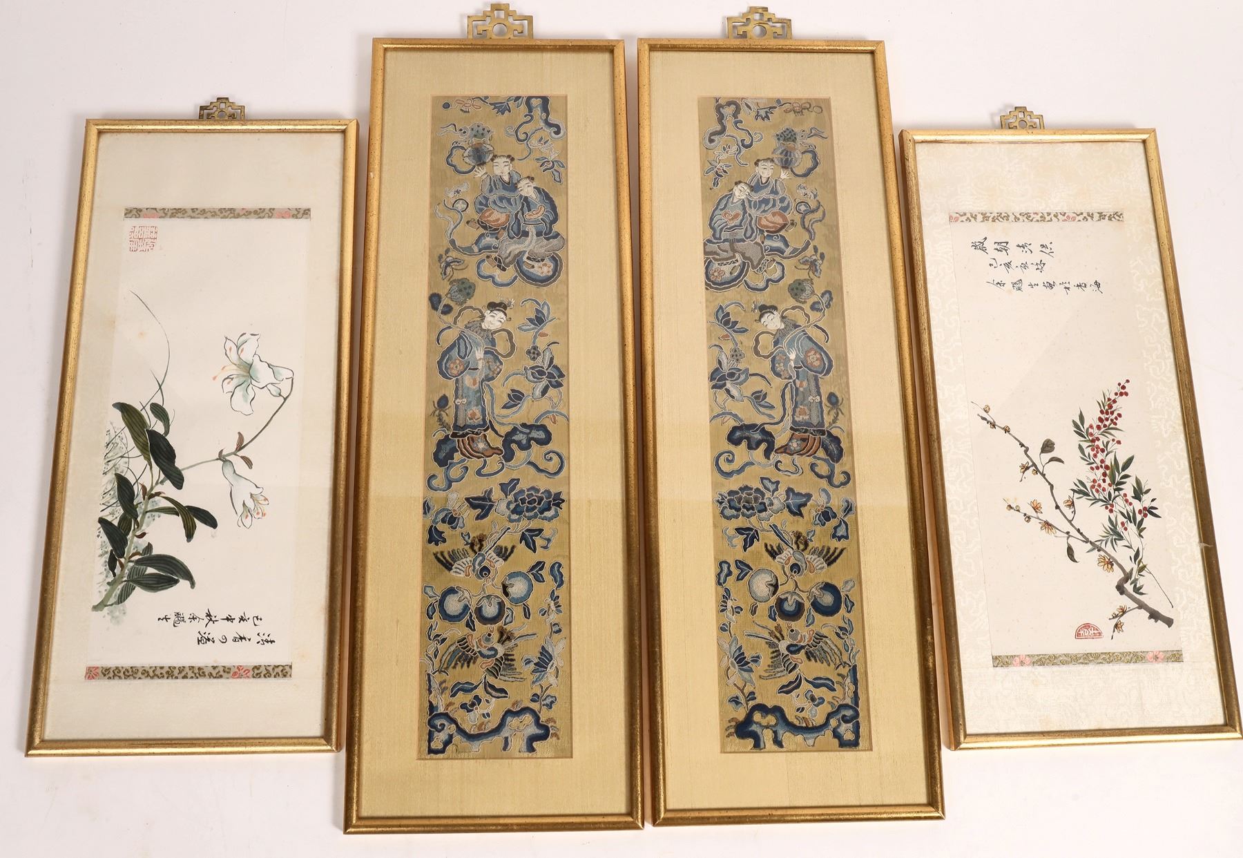 Lot of 4 pieces of framed Asian art. Two are watercolor paintings of flowers with Japanese or Chinese writing on them. The other two are embroidery pieces with intricate designs. All four pieces are professionally framed by Sue Page Shop in Wellesley, Massachusetts. Good condition. The smaller ones are 7.75 x 17.75 inches, the larger ones are 7.5 x 22.5 inches. Good condition.