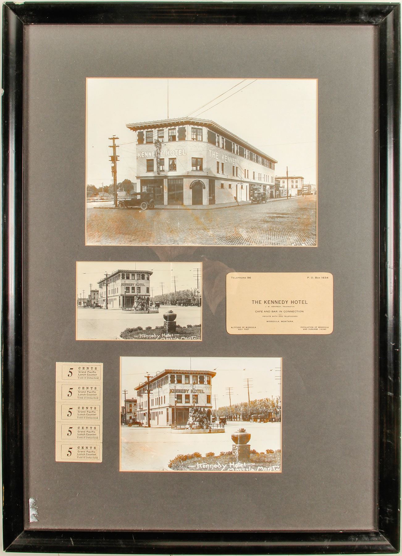 3 Kennedy Hotel images, 1 large, 1 RPC? and enlarged photo of RPC. 5 paper lunch counter coupons and business card. 23x17" State: Montana City: Missoula Date: HWAC# 86432