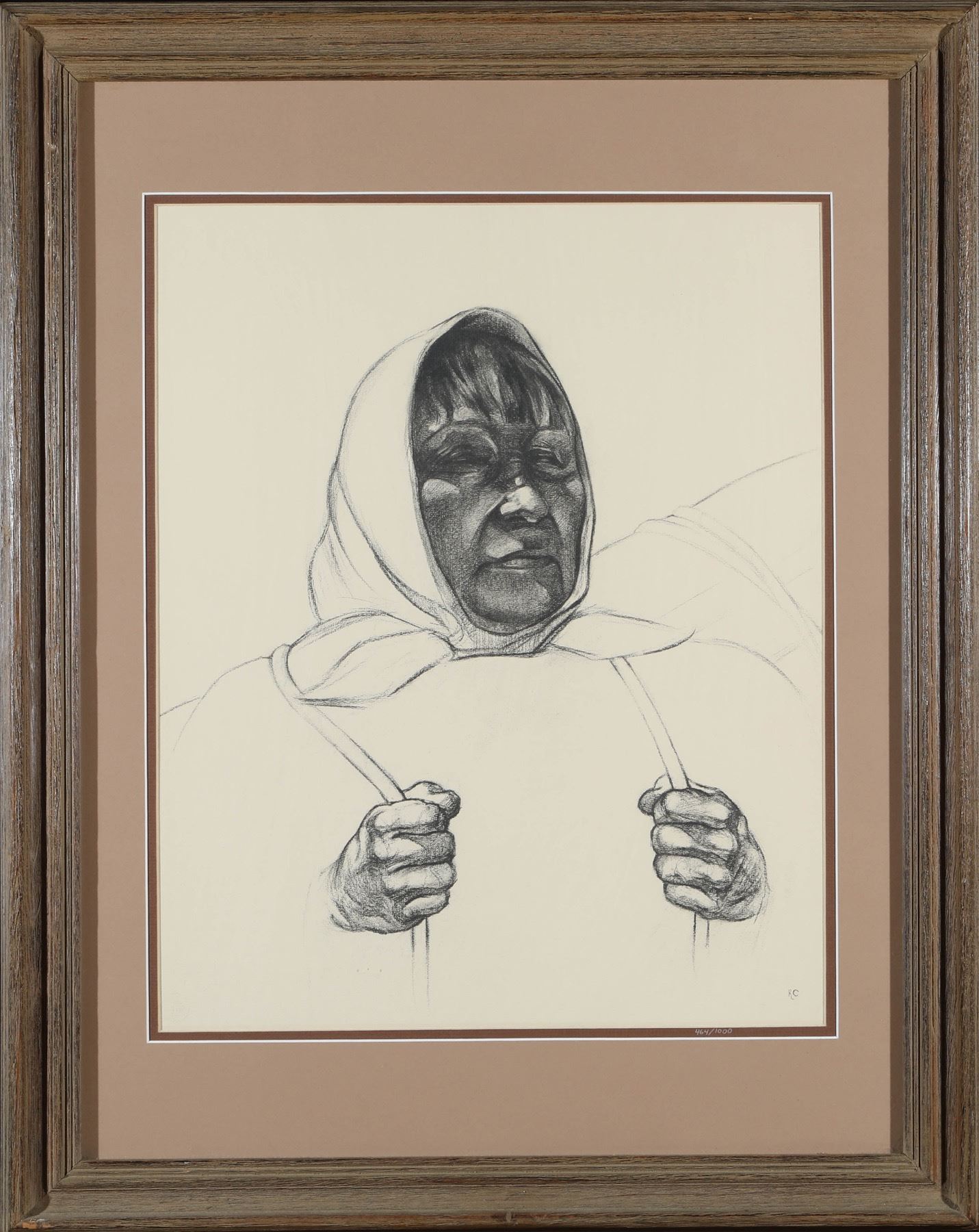 Framed Native American woman with a darkened face and forward hands. Charcoal print. Signed RC 464/1000. 19.5x15", frame 29x23.2"