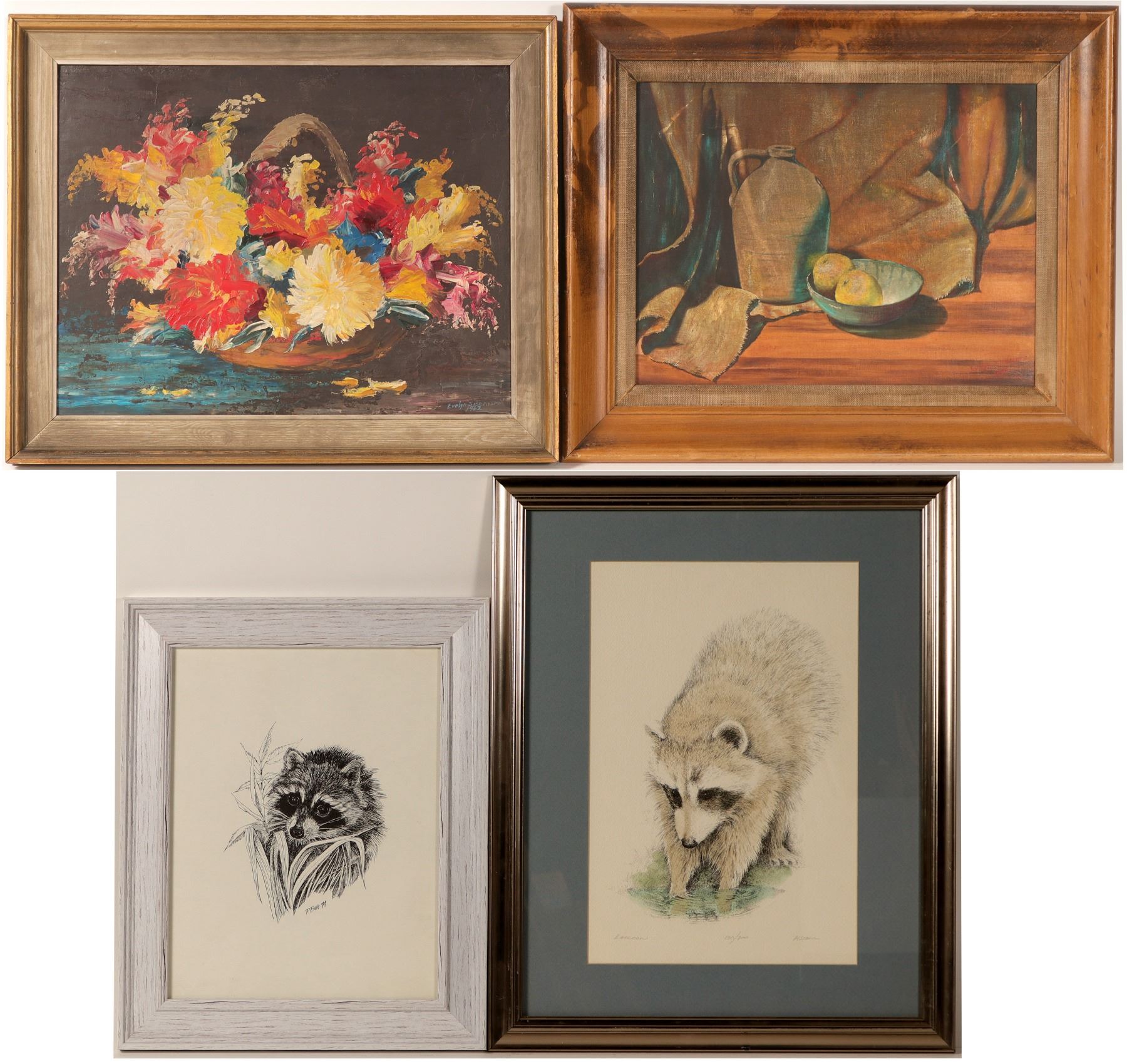 Raccoon watercolor print 130/200 by M Sta??? 22x18.5". Fruit Arrangement oil painting by Sisemore 1963 17.75x21.5". Flowers oil painting by Sisemore 1962 17x21". Racoon pen and ink drawing by P Bang 1974 17.5x14.5"